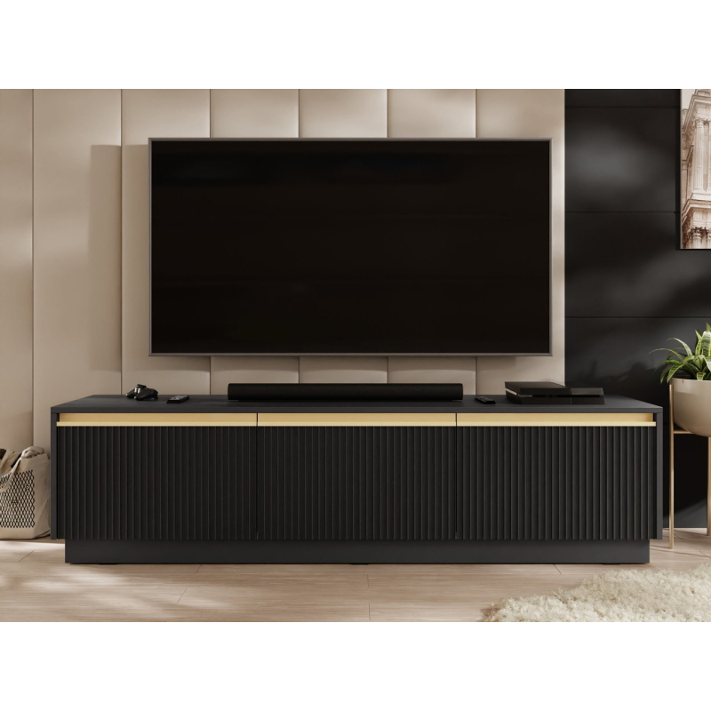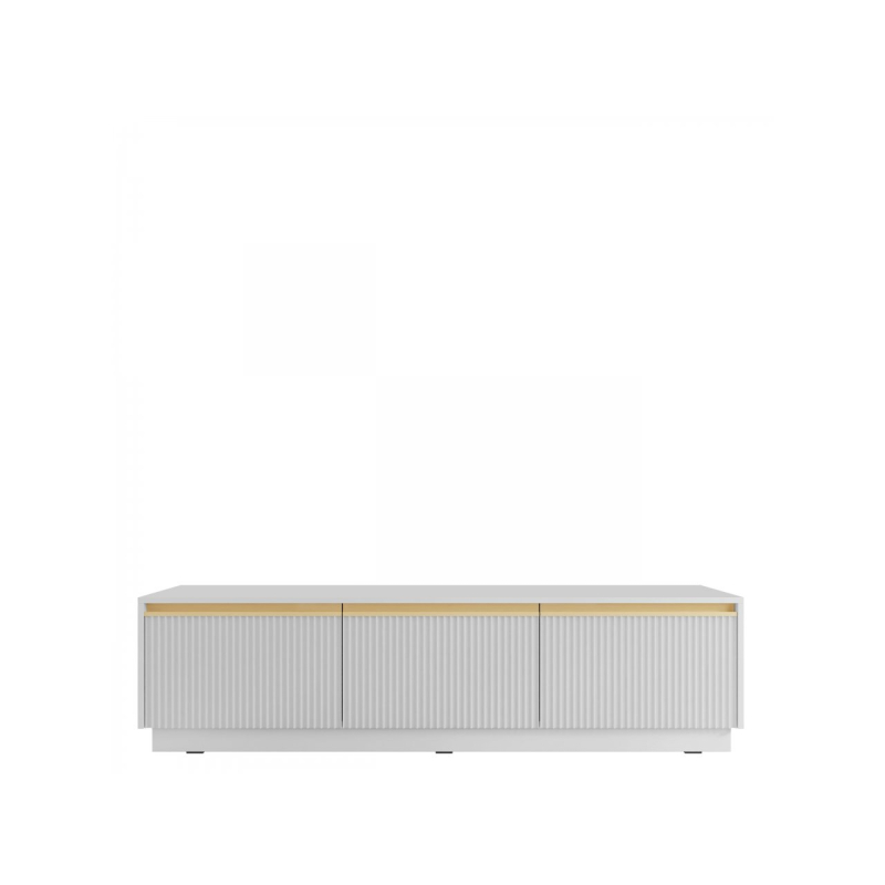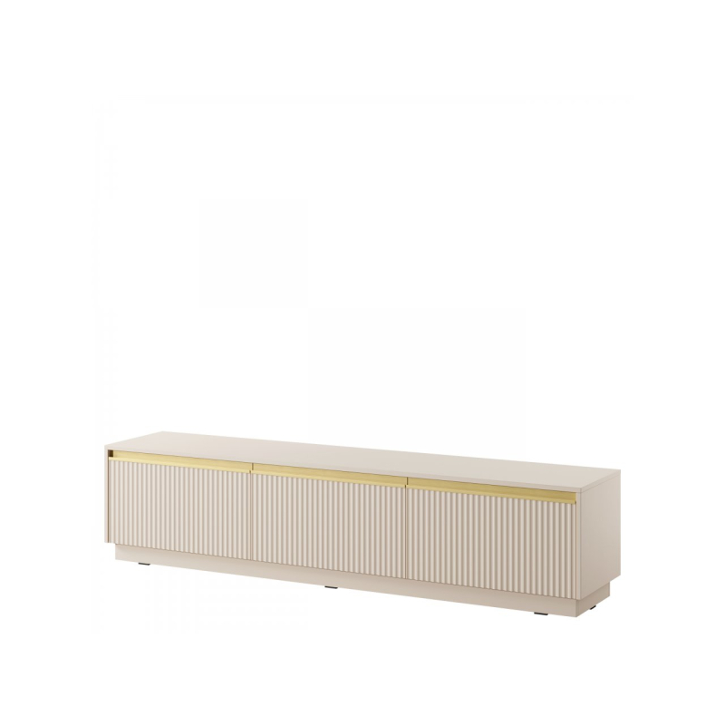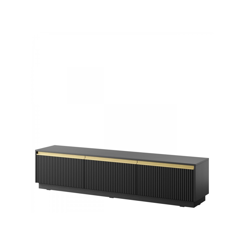 TV skříňka Roleno 180 cm zajišťuje módní vzhled obývacího pokoje. Minimalistický tvar zdobí rýhovaná čela a zlatá vsadka. Skromný, ale výrazný vzhled skříně zatraktivní i velmi skromný interiér. Dokonale se hodí do moderního obývacího pokoje ve stylu loft a interiéru inspirovaného půvabem.