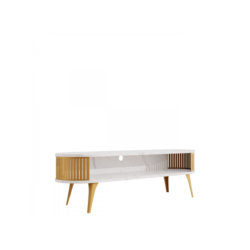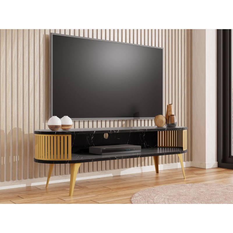 Dodejte TV oblasti ve vaší domácnosti osobitý vzhled. Postará se o to prohnutá TV skříňka Mozimo Złoty. Originální vzhled nábytku vyniká nad ostatními produkty v této kategorii. Starají se o něj mimo jiné. prolamované vložky po stranách. Detaily odpovídající barvě nohou zdůrazňují design inspirovaný glamour.
