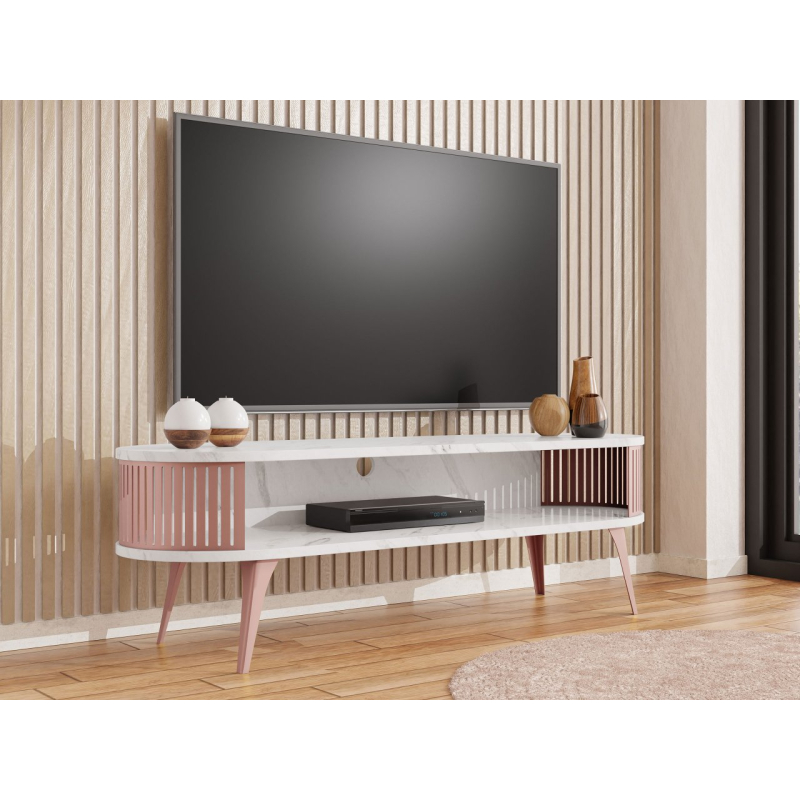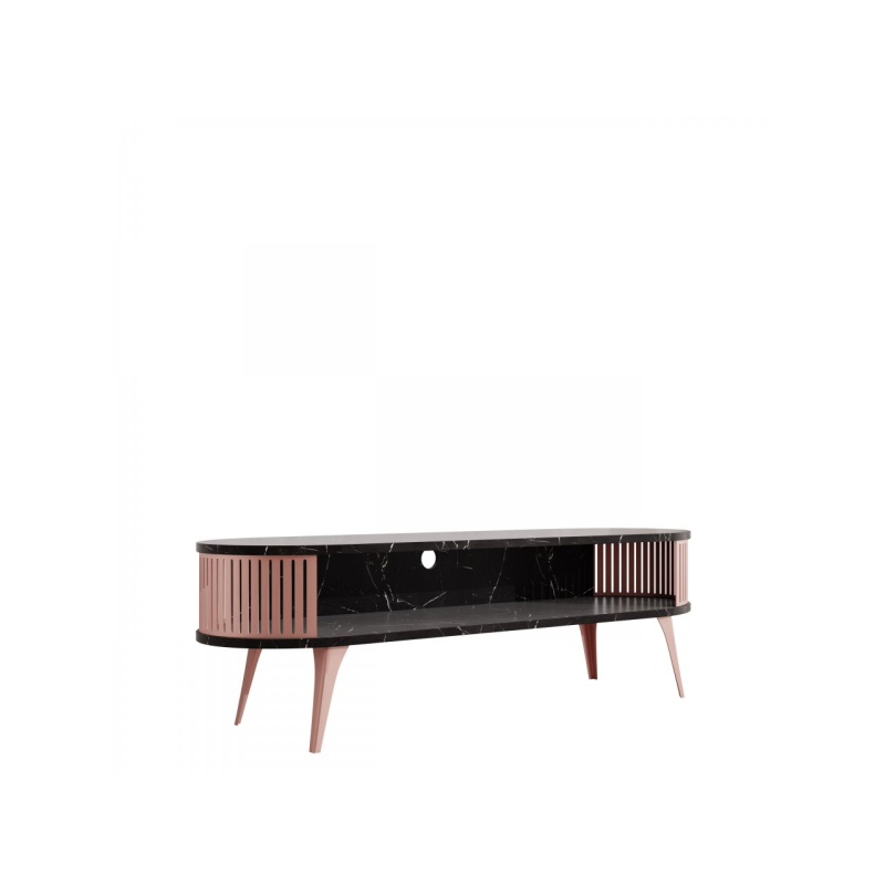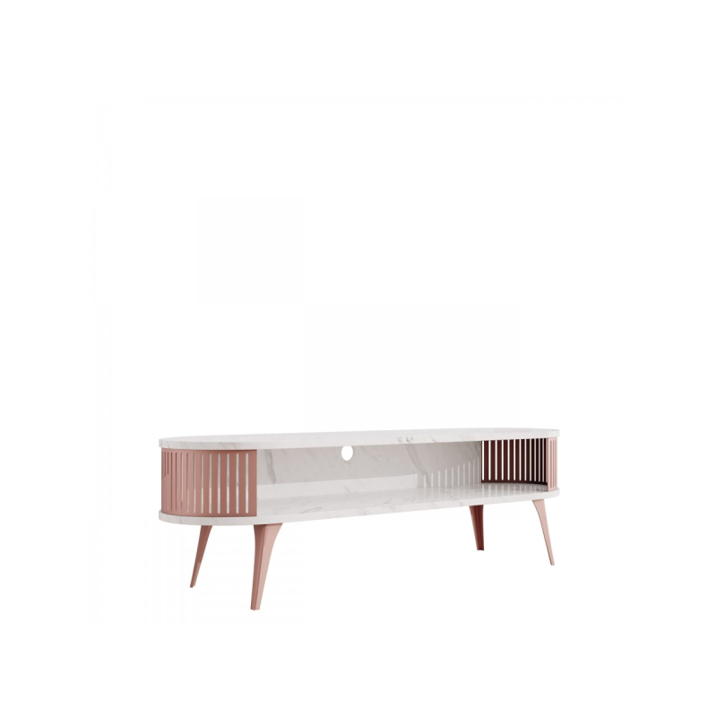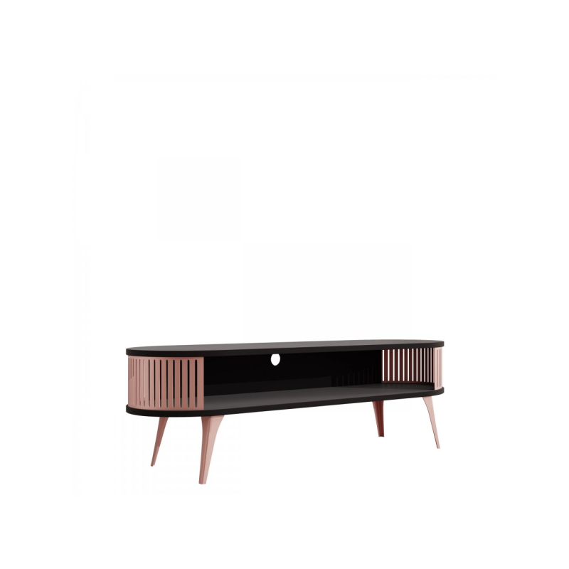 Ozdobte stylově! Oválná TV skříňka Mozimo Ember vám umožní vytvořit pod televizí jedinečný prostor. Vyznačuje se zaoblenými a ozdobnými stranami. Je vyvýšený na subtilních nožičkách, které dodávají celku lehkost a jemnost. Stolová deska o šířce 140 cm je skvělým místem pro umístění různých dekorací. Televizní stolek nabízí dostatek prostoru pro multimediální vybavení a uložení drobností. Nábytek se vyznačuje měděným barevným akcentem.
