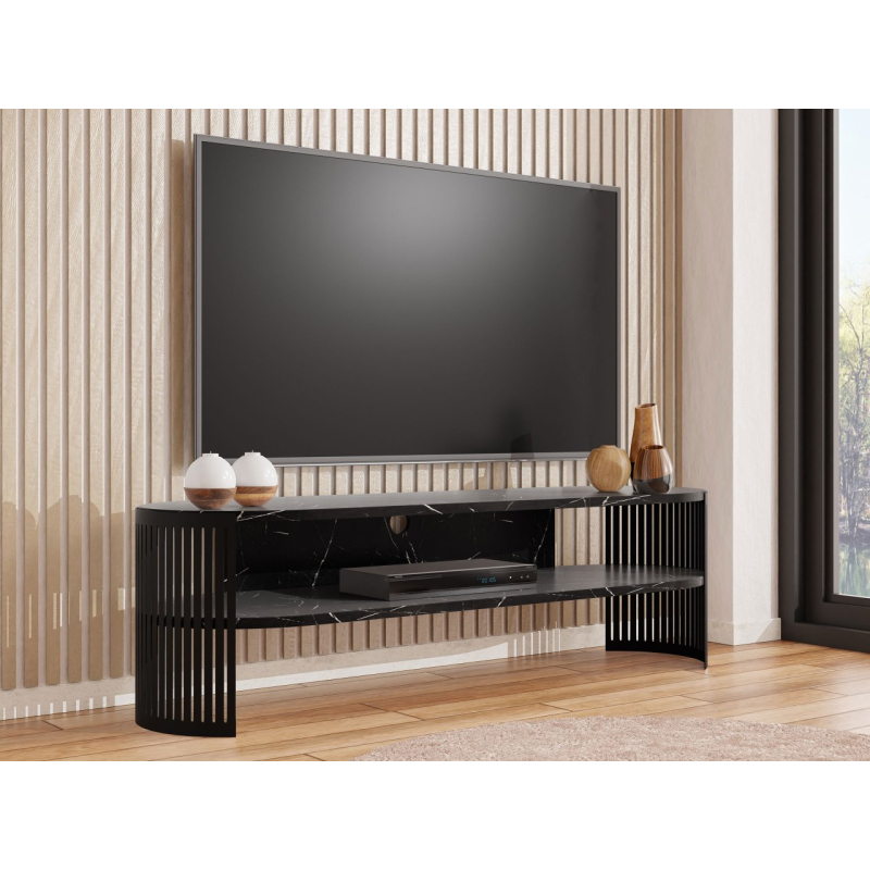 Za povšimnutí stojí zajímavá konstrukce tohoto kusu nábytku. Televizní stojan Zinzit se skládá ze dvou vrchních dílů spojených černým ocelovým rámem. Vzhled TV skříňky odkazuje na současné trendy s nádechem loft stylu.