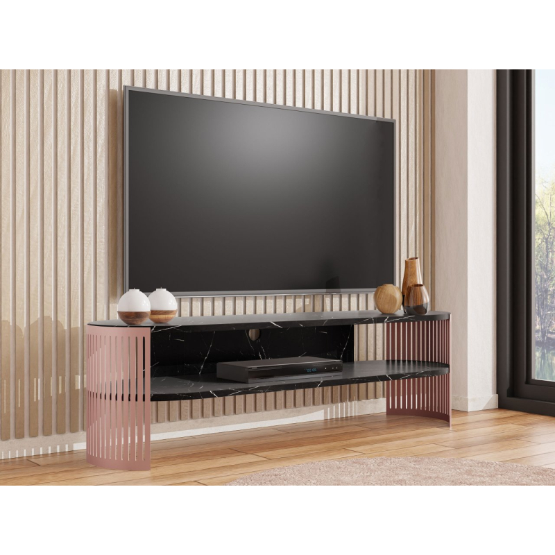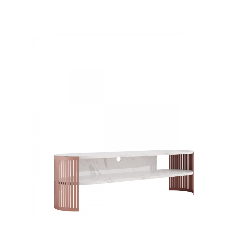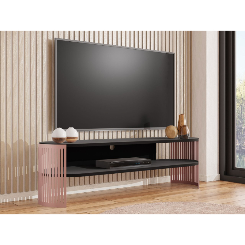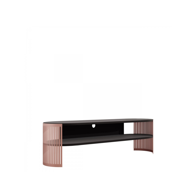Dejte moderní charakter uspořádání TV koutku ve vašem obývacím pokoji. S tím vám pomůže TV skříňka Zinzit Ember s kovovými vložkami. Oválný tvar nábytku rozbíjí nudu aranžmá, ba co víc, nahrazuje jej netradičním doprovodem.