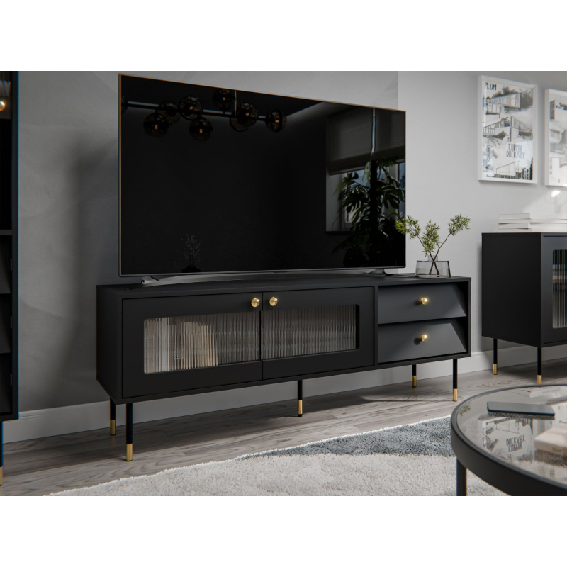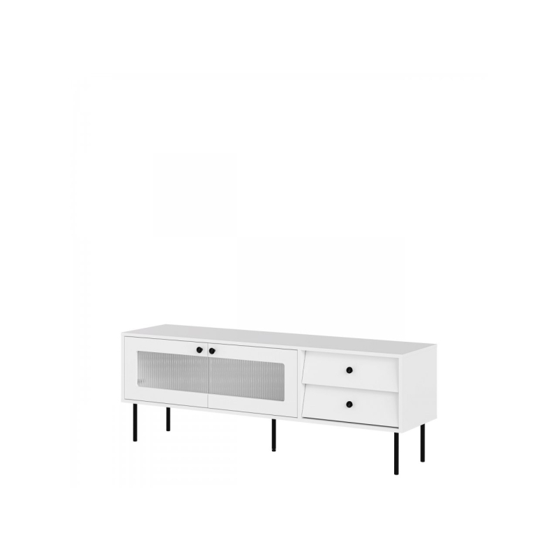 Co jako první upoutá, je originální uspořádání zásuvek. Bez snížení jejich kapacity zdůrazňuje módní vzhled tvaru. Skleněná část TV komody navíc potěší svou drážkovanou úpravou. Módní detail v podobě drážek vyfrézovaných ve skle zdobí prostor a také výhodně kamufluje předměty uspořádané uvnitř.