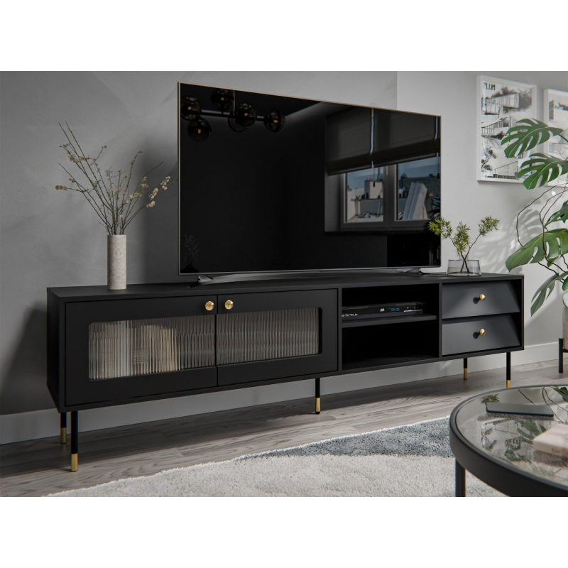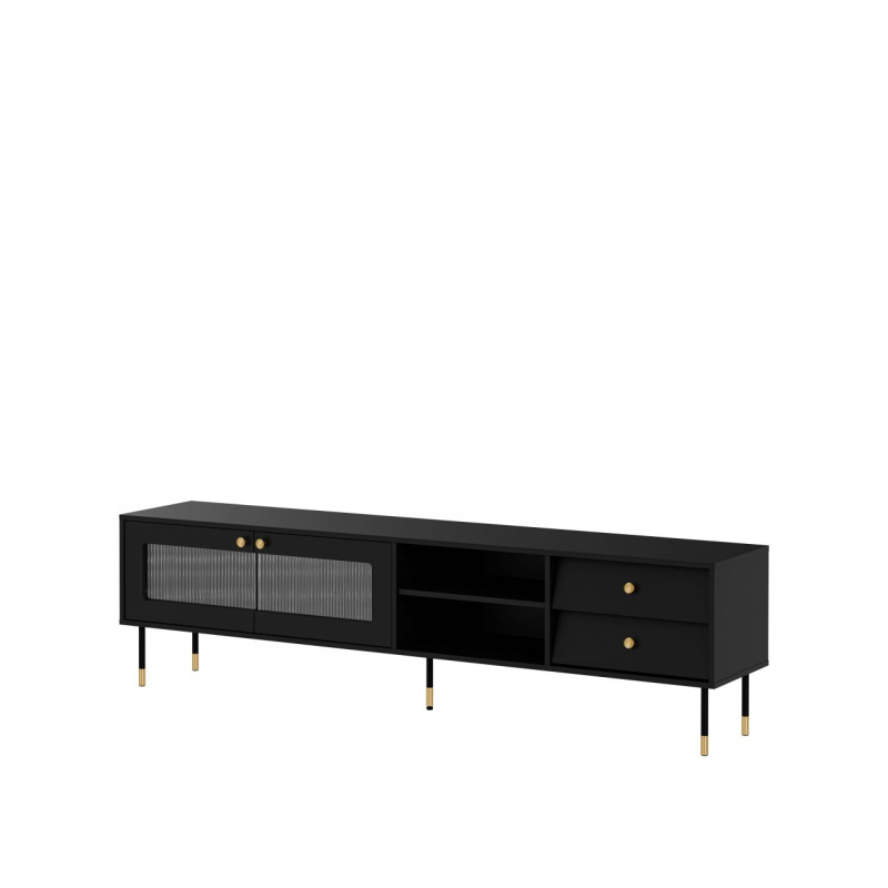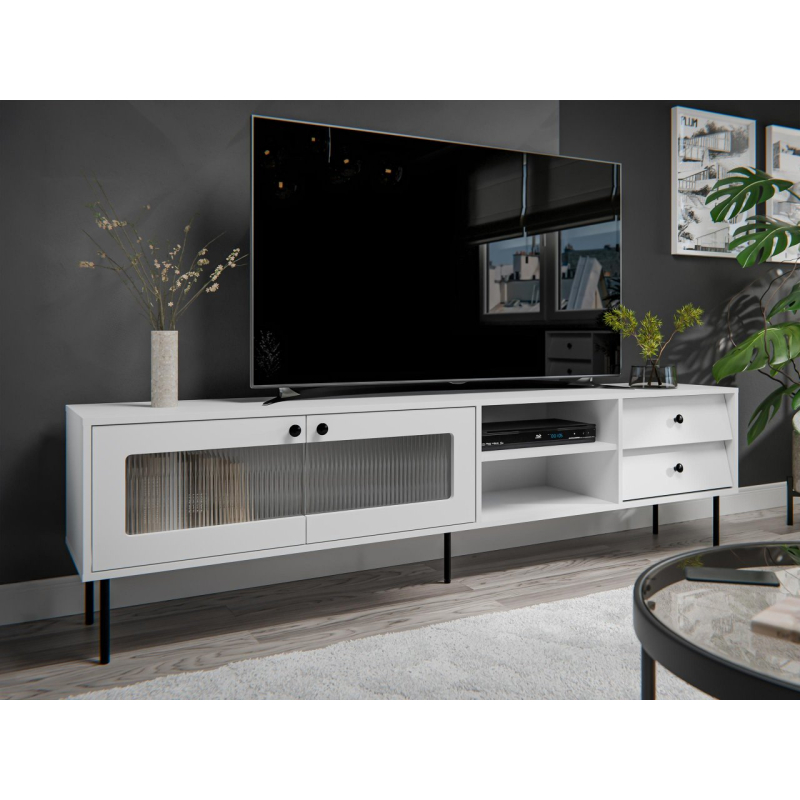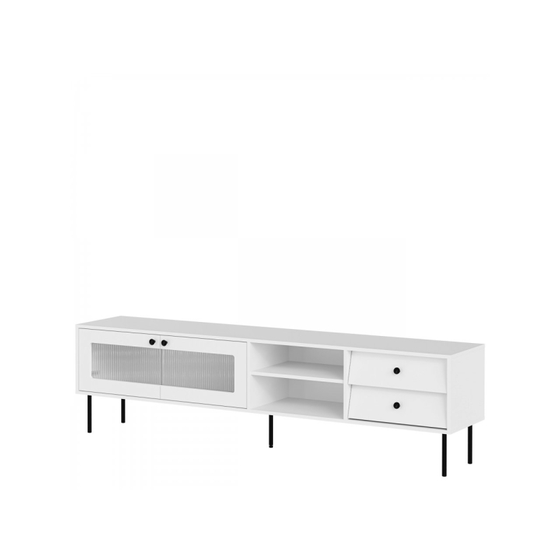 TV skříňka Aurezi 100 kombinuje styl 80. let s moderním nádechem. Jeho geometrické tvary připomínají design tohoto desetiletí, ale detaily dodávají svěží a stylový nádech. Nábytek má dvě zásuvky, ideální pro skladování, a dvě otevřené police, které se skvěle hodí pro RTV zařízení nebo dekorace. Televizní skříňka navíc ukrývá prostornou část s drážkovaným skleněným prosklením, která decentně zobrazuje obsah. Celek je jednoduchá, ale efektní forma, vhodná do mnoha interiérů.