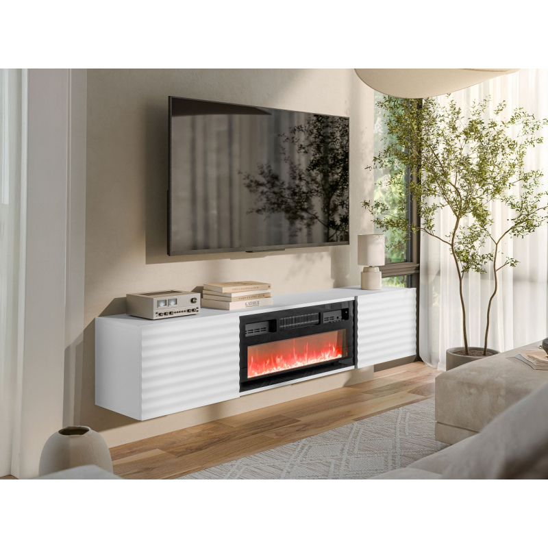 Hlavní výhodou prezentované závěsné TV skříňky je krb. Má nastavitelné topení, dálkové ovládání a krb ve tvaru křišťálu. Ideální do každého obývacího pokoje. Přinese teplo a pohodu, perfektní zejména během podzimních a zimních večerů.