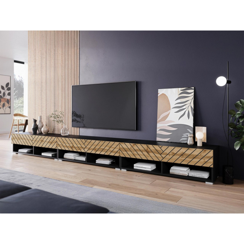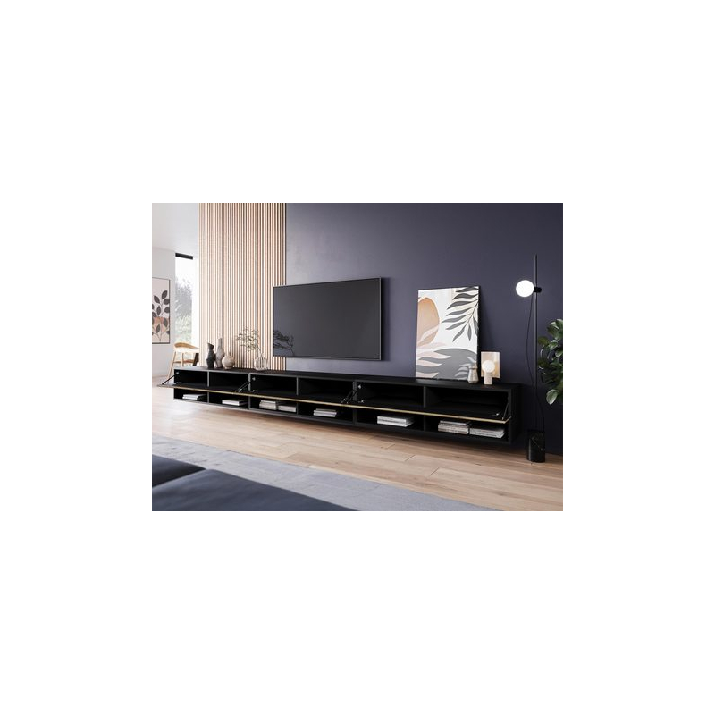 Mezi výhody TV skříňky 300 cm patří četné odkládací přihrádky. Naleznete zde prostorné police a uzavřené přihrádky. Bezúchytkový systém otevírání dodává prezentovanému modelu moderní vzhled – čela mírně přesahují desku.