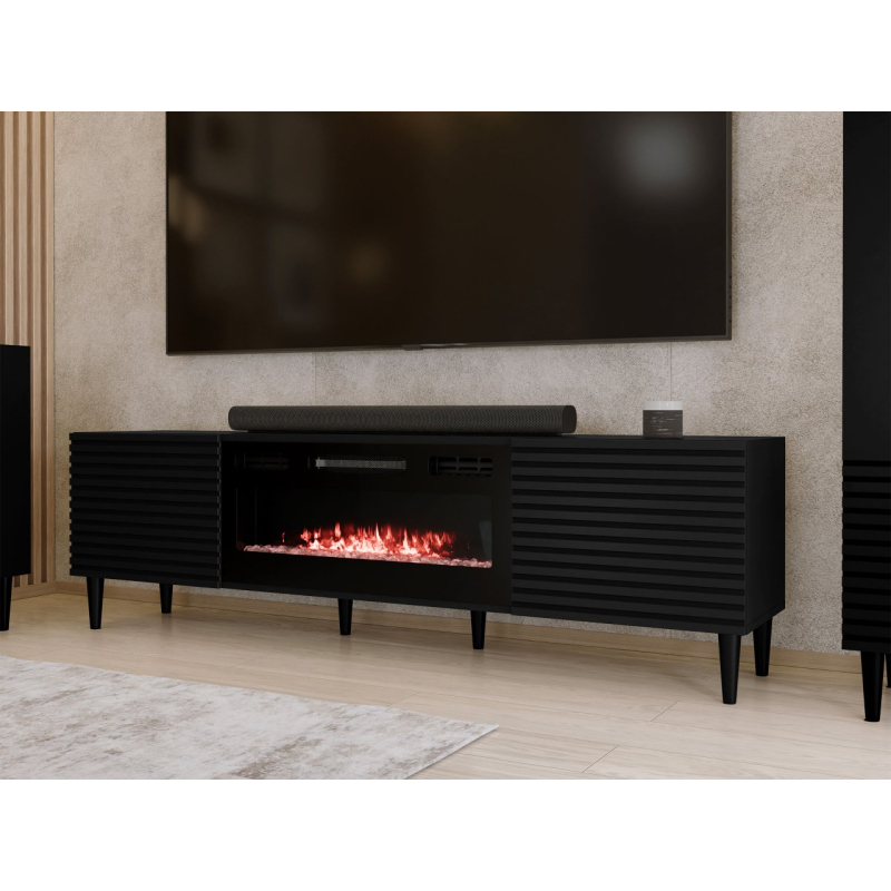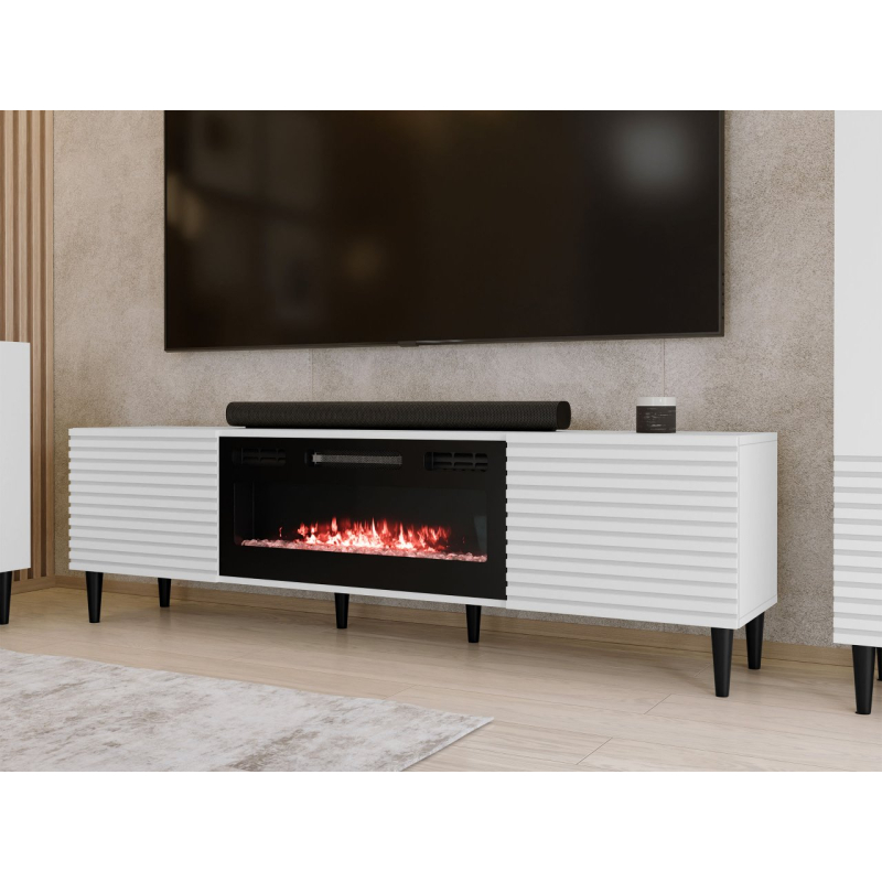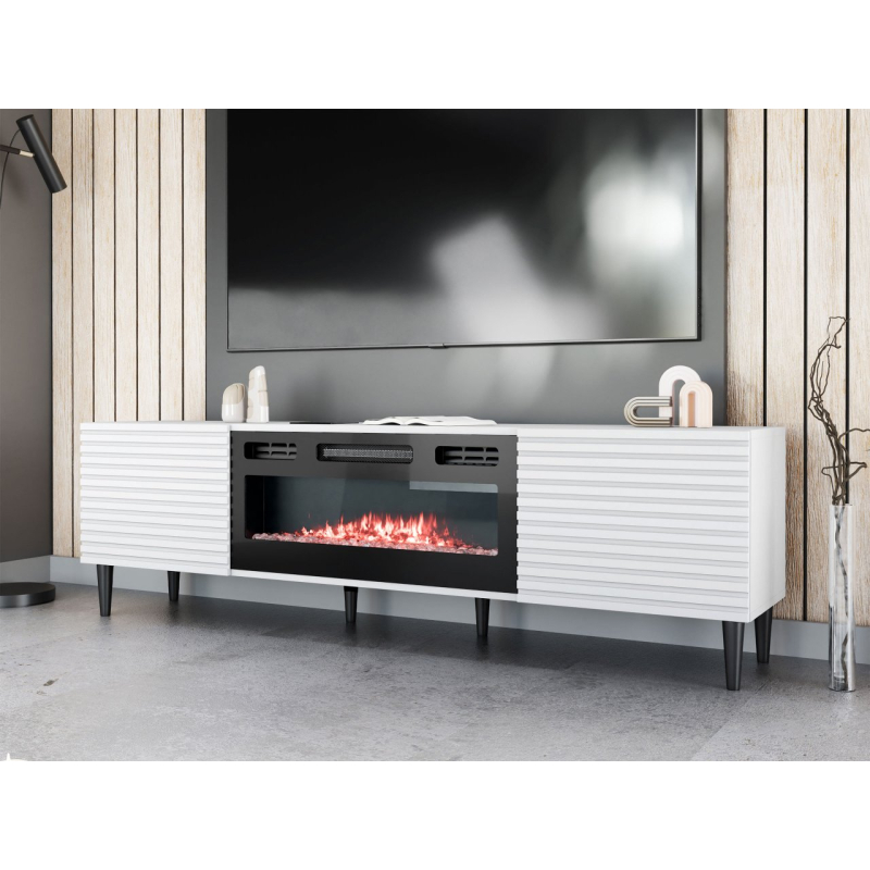 Představte si chladné večery obklopené jedinečnou atmosférou. Televizní skříňka Sorleto 2K EF s krbem dodá každé místnosti útulný charakter. Je ideální náhradou za tradiční krb a má i funkci topení. Jedná se o model, který zaujme už jen svým vzhledem. Krb je doplněn ozdobnými drážkovanými čely a vysokými nohami. Tento design dodává interiéru nádech lehkosti a usnadňuje udržování pořádku na podlaze.