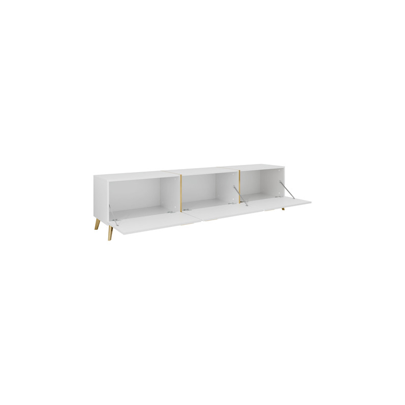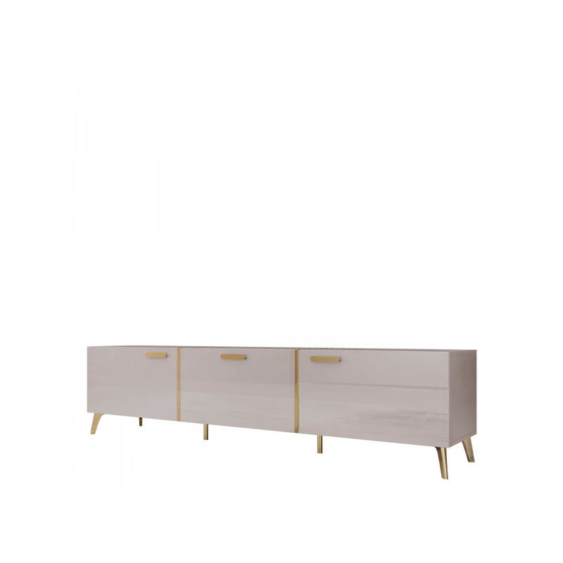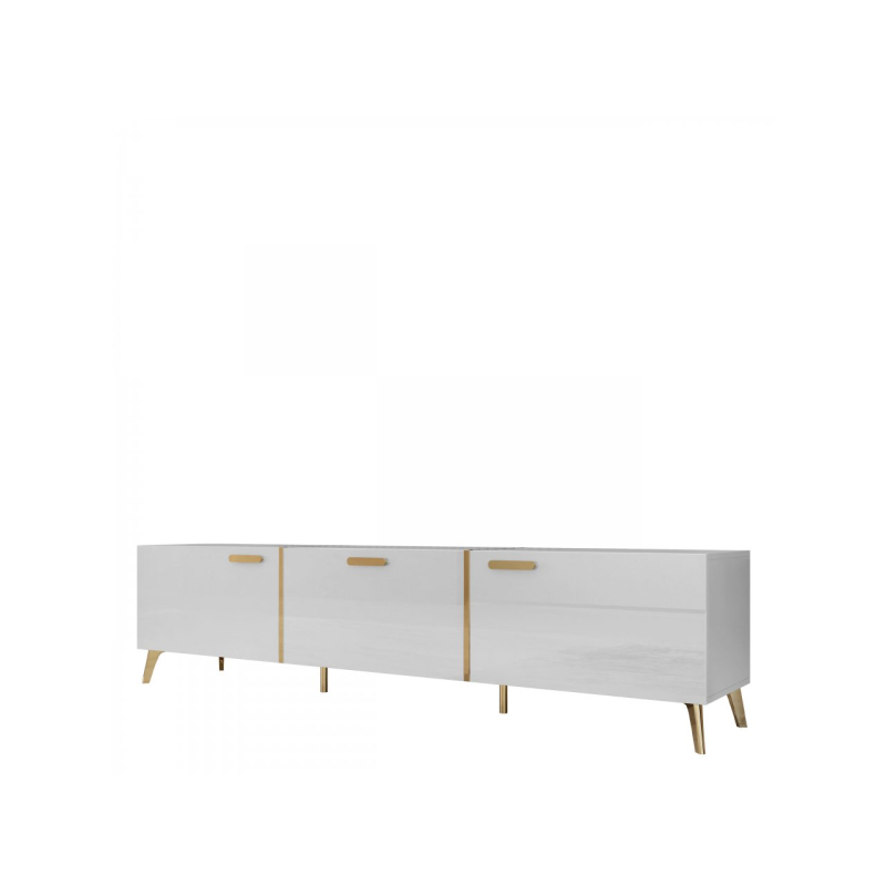 Výhodou TV skříňky je její prostorný interiér. Vyšší nastavení přináší světlost a světlé barvy a lesk opticky zvětšují okolí. Tento design také usnadňuje udržování pořádku pod nábytkem. Celek doplňují úchyty zlaté barvy.