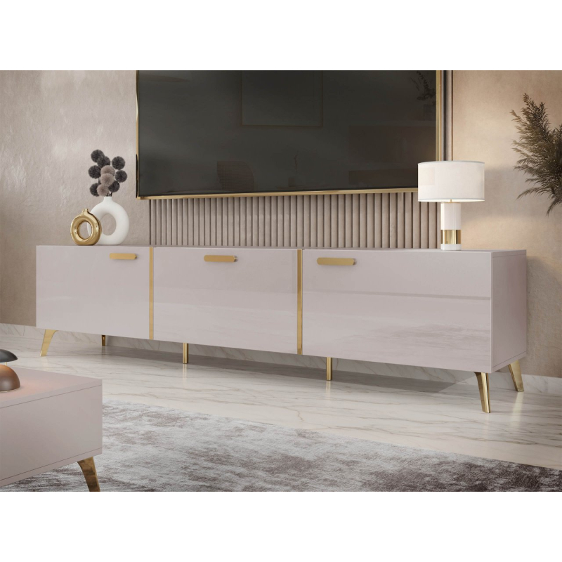 Elegance ve stylu glamour je dokonalým způsobem, jak zařídit moderní interiér. Moderní 3D TV skříňka Rostiw 200 je kombinací lesku, zlatých detailů a vysokých nožiček. Bude skvělým základem pro audiovizuální techniku, atmosférickou lampu nebo drobné dekorace.