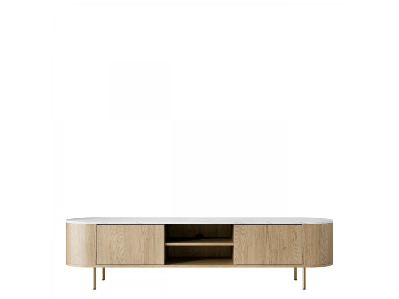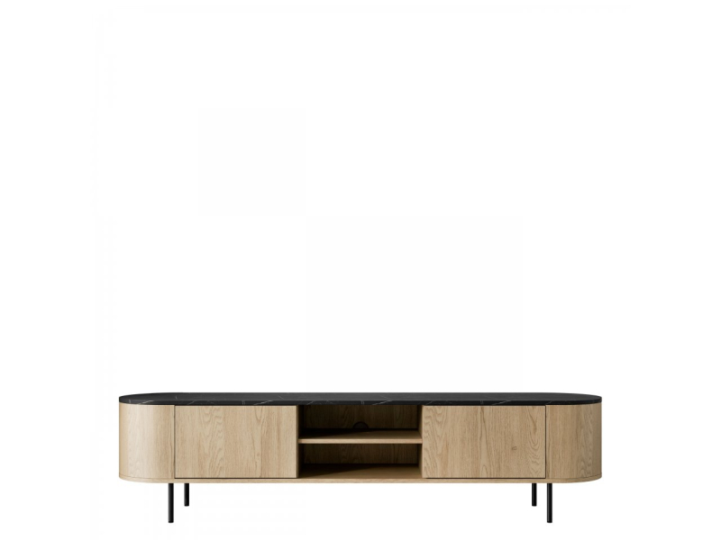 Zaoblené strany televizního stolku Nisken 180 2D narušují klasickou symetrii tohoto typu nábytku. Stolová deska s výrazným mramorovým vzorem, dostupná ve dvou barevných variantách, zdůrazňuje rafinovaný charakter nábytku a poskytuje výrazný, ale zároveň nenápadný dekorativní prvek. Totéž platí pro vysoké, minimalistické nohy, které dále usnadňují čištění podlahy.