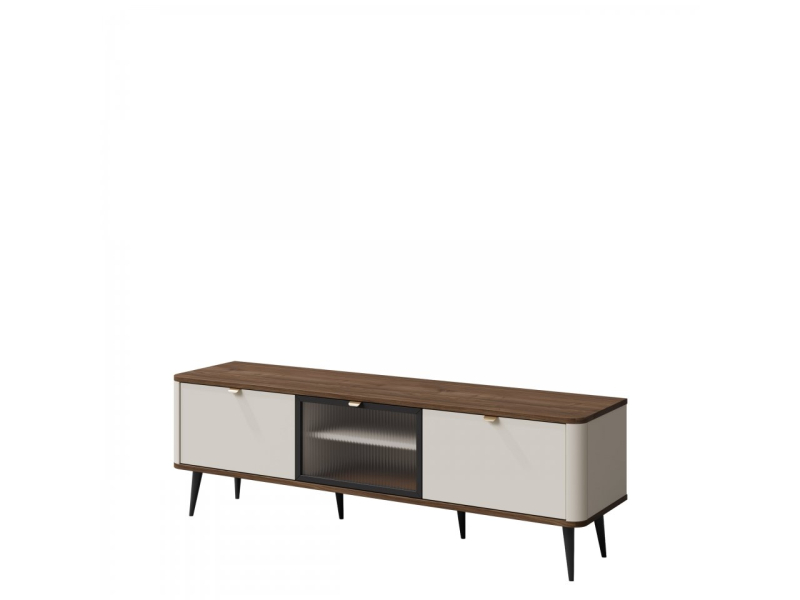 Tento model se může pochlubit nejen praktičností, ale také dekorativní hodnotou. Hlavní výhodou TV stolku je jeho decentní kašmírová povrchová úprava. Přední strana z tvrzeného skla dodává celému designu nádech elegance. Celá konstrukce spočívá na vysokých nohách.