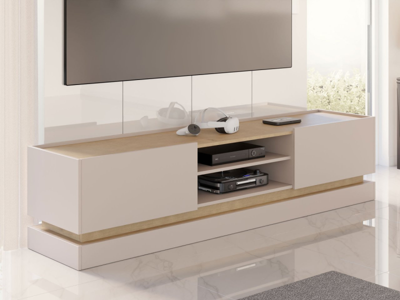 Sofistikovaný vzhled je mimo jiné patrný také z unikátního podstavce. Tento malý, ale dekorativní detail potvrzuje moderní charakter nábytku. Plusem jsou také prostorné skříňky a otevřené police pro televizní vybavení. Tento organizovaný úložný prostor je ideální pro domácí kino.