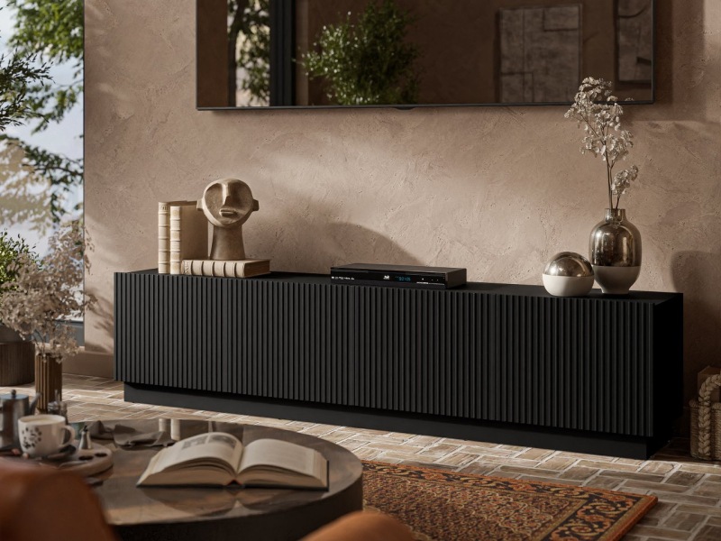 TV stolek je umístěn na pevném podstavci, který poskytuje stabilitu a ucelený geometrický tvar. Prostorná vrchní deska je ideální pro přijímač, multimediální zařízení nebo dekorativní předměty. TV stolek o rozměrech 200 cm je funkční a esteticky příjemný kus nábytku, který doplní design každého obývacího pokoje.