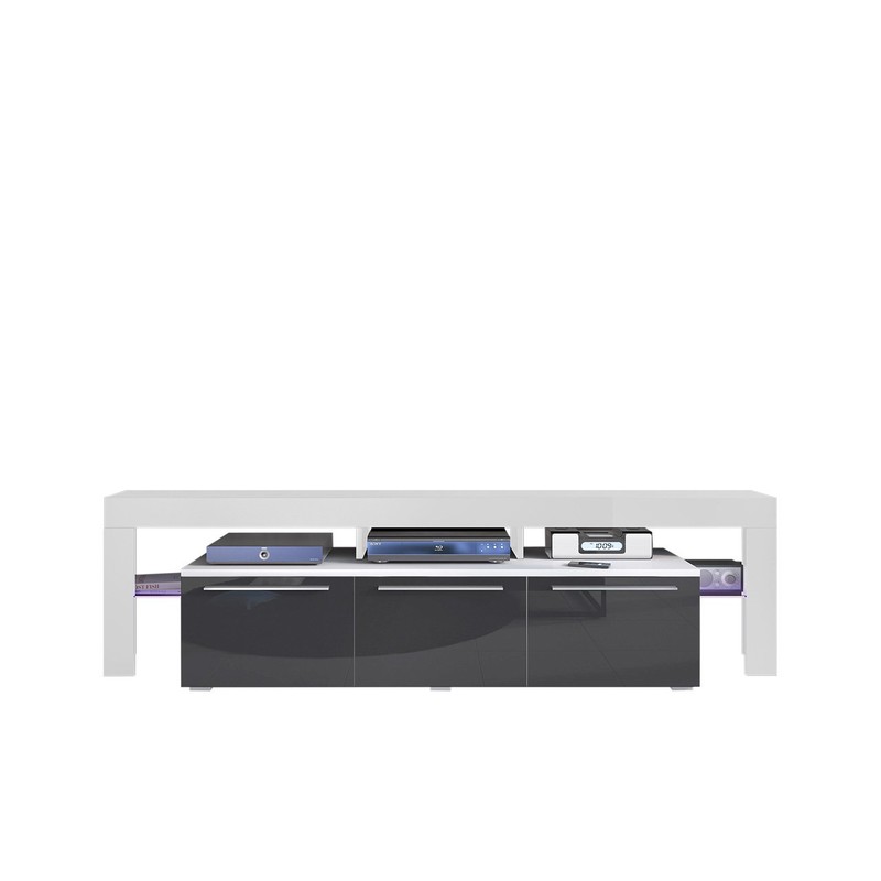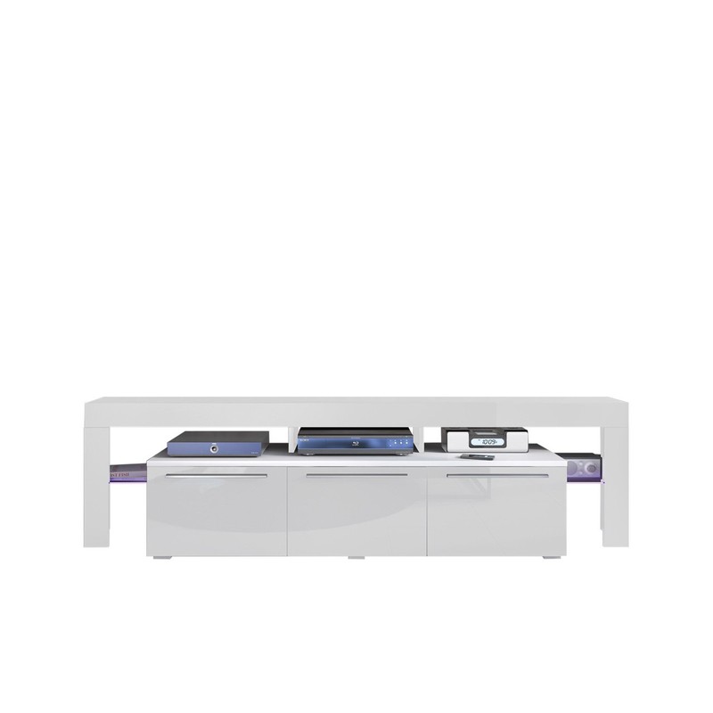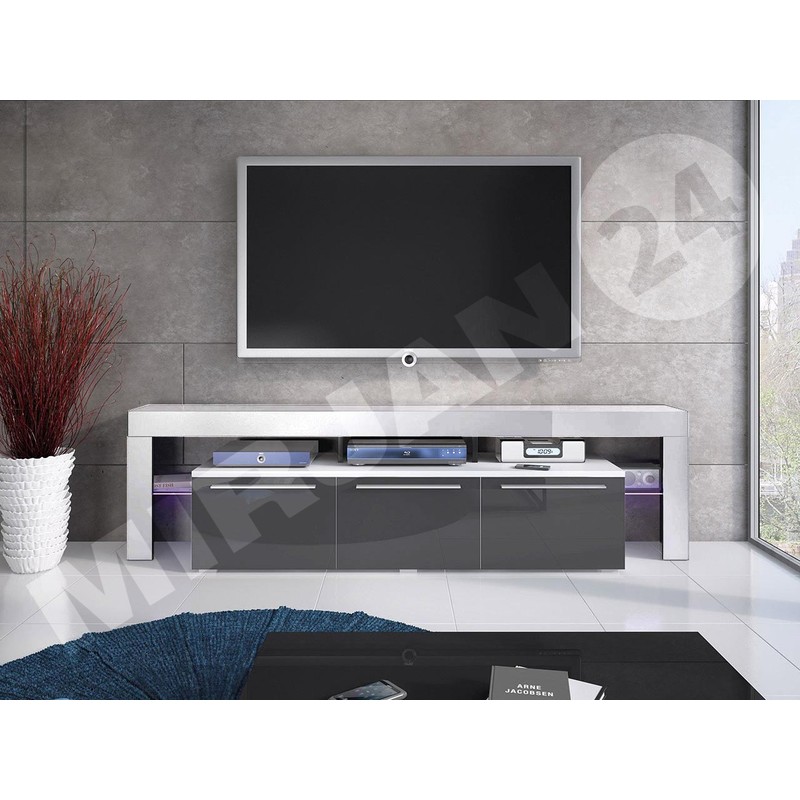 Moderní TV skříňka Quatro 150 Plus doplní interiér každého obývacího pokoje a ložnice. Laminátová deska dělá z TV skříňky kousek odolný proti poškrábání. V otevřených skříních najdete police. Matný korpus s frontami s vysokým leskem jsou perfektní kombinací pro dosažení zajímavého designu. Moderním detailem jsou skleněné police s přídavným osvětlením LED (součástí balení).