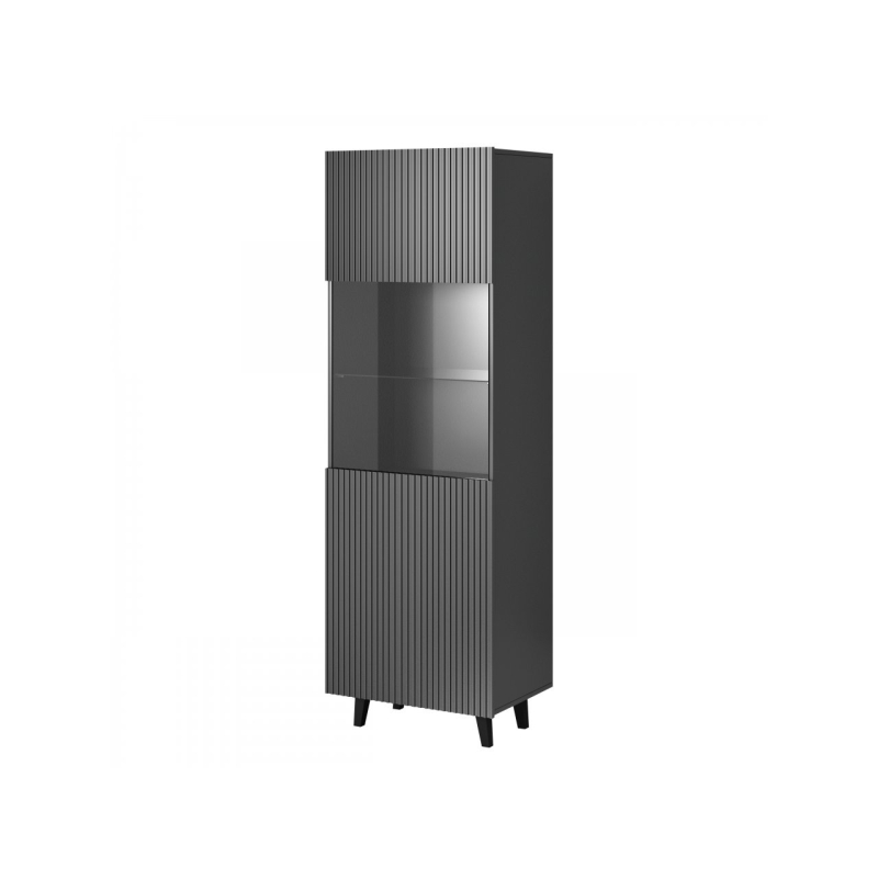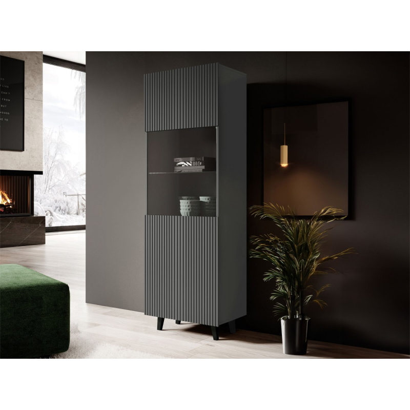 Hledáte kus nábytku, který dokonale doplní prostor ve vaší domácnosti? Představujeme vám pokojovou vitrínu Tilderi Grey. Jednoduchý design byl prolomen podélným frézováním na přední straně a také vysokými nohami v černé barvě.