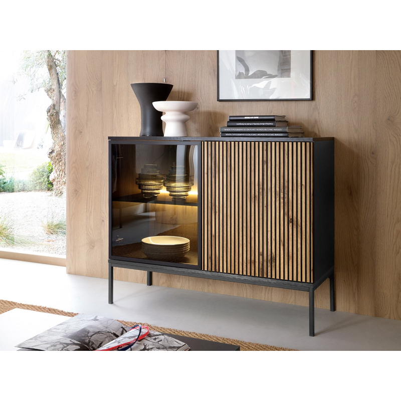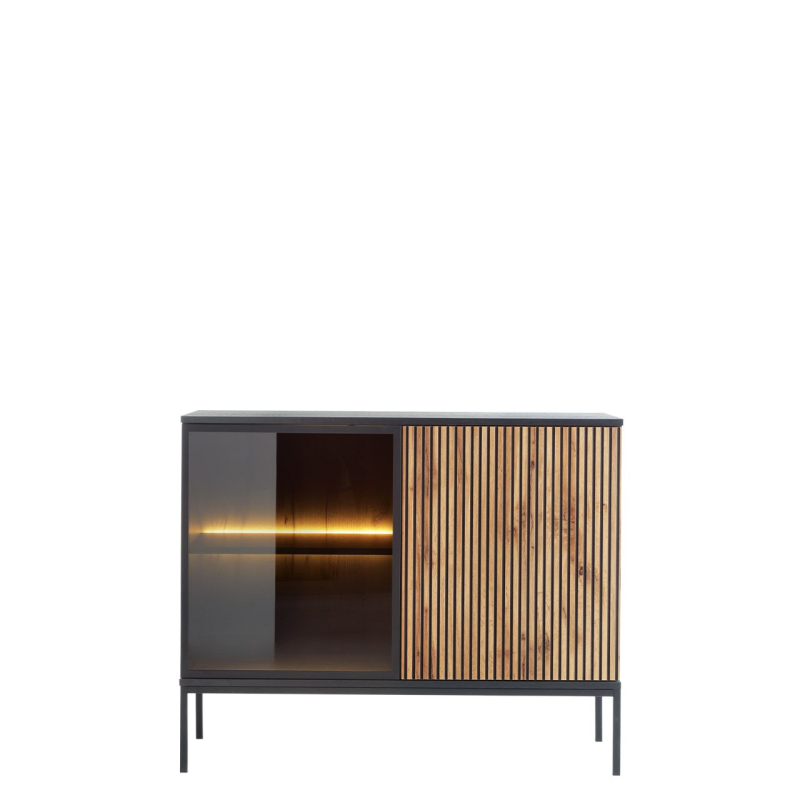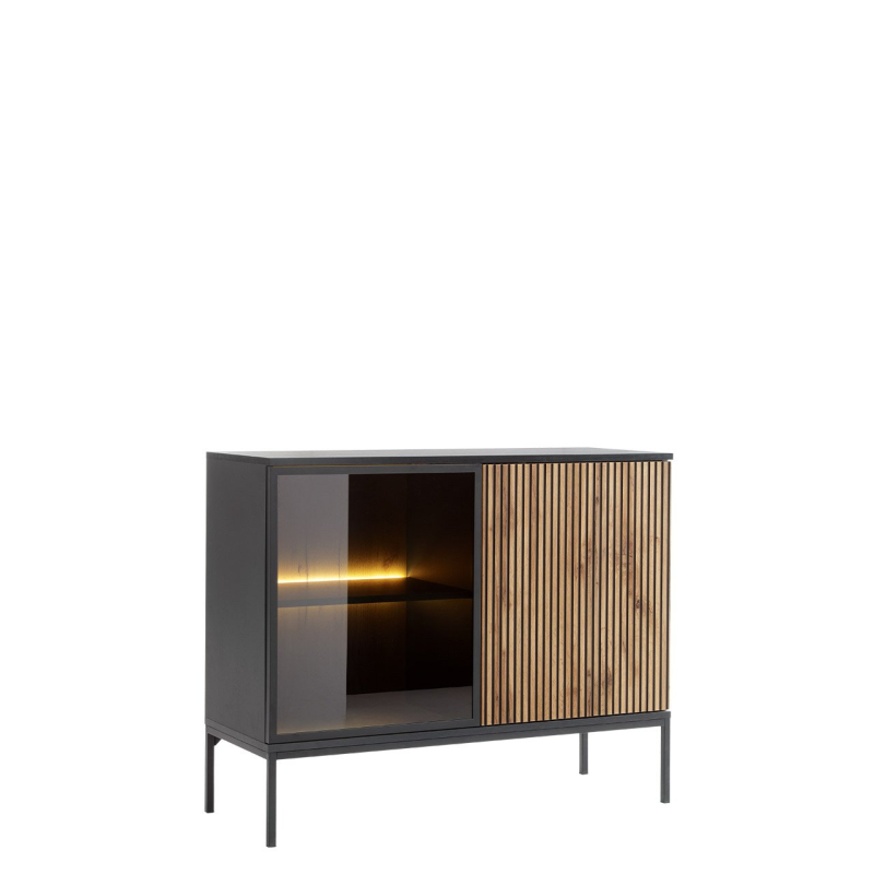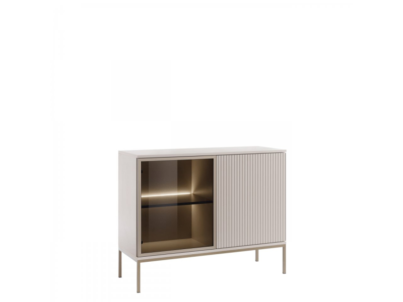 Vysoké nohy dodávají vitríně optickou lehkost. Zeštíhlují korpus, ba co víc, působí subtilně. Výhodou je také systém otevírání push to open. Usnadňuje přístup dovnitř nábytku, což ještě více podtrhuje stylový vzhled tohoto modelu.