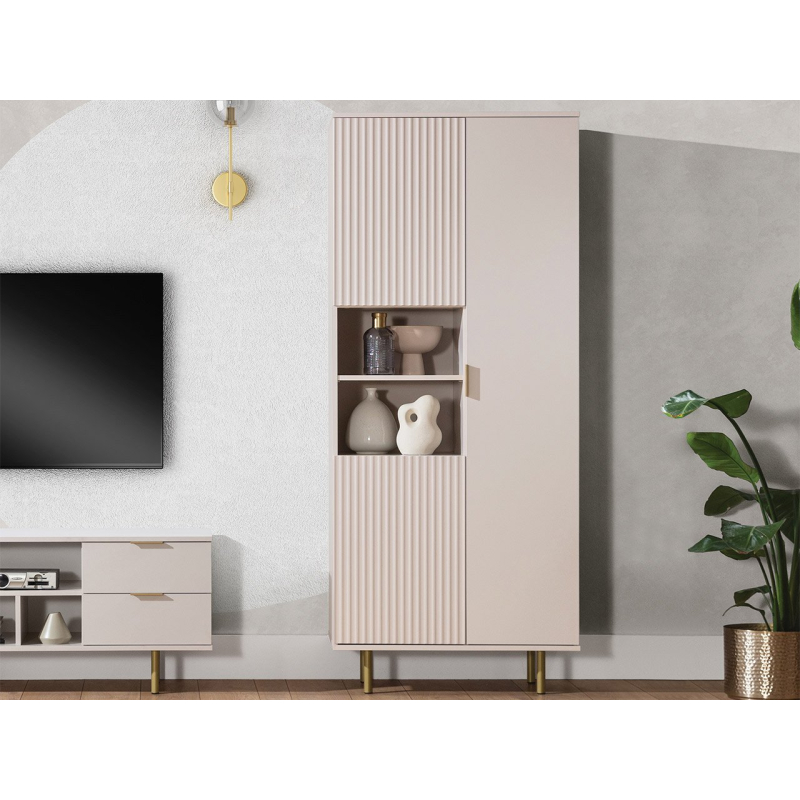 Vitrína Nawil R3D NW05 je elegantním a funkčním řešením pro mnoho aranžmá. Jeho jedinečnost spočívá v částečně frézovaných čelech, která nábytku dodávají subtilní, designový charakter. Celek je dokonale zdůrazněn kovovými madly a nožičkami. Takto umístěný nábytek pomáhá udržovat podlahu uklizenou.