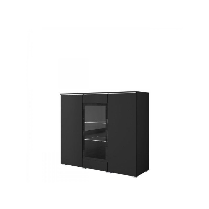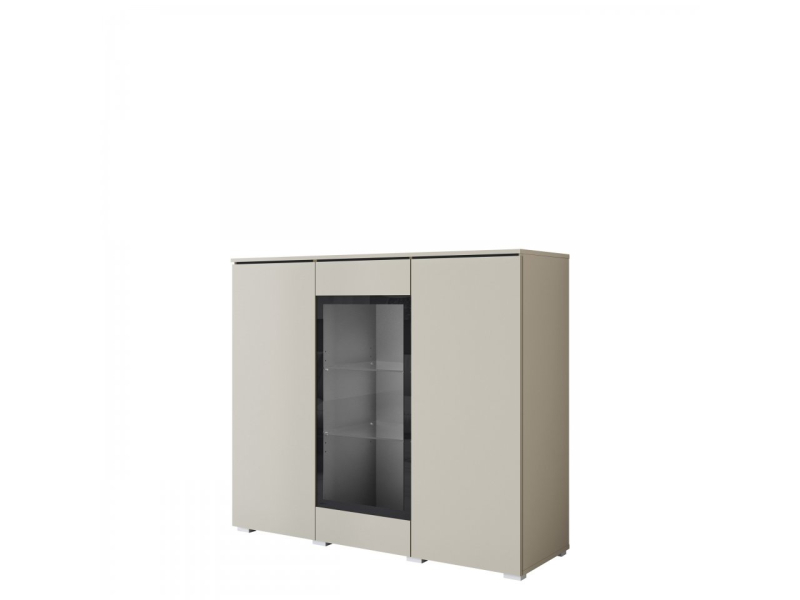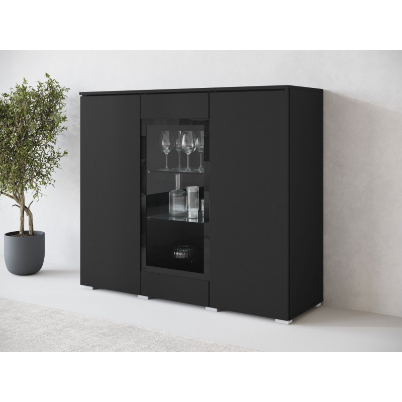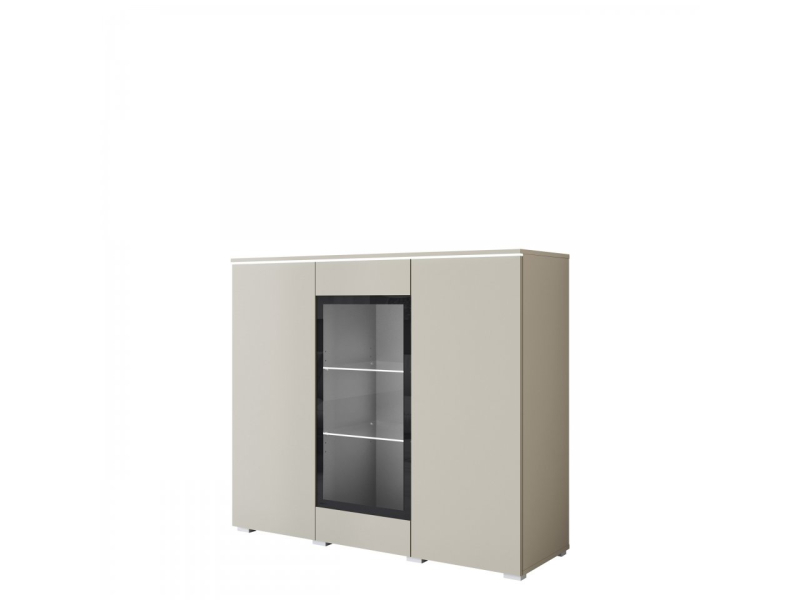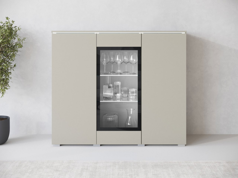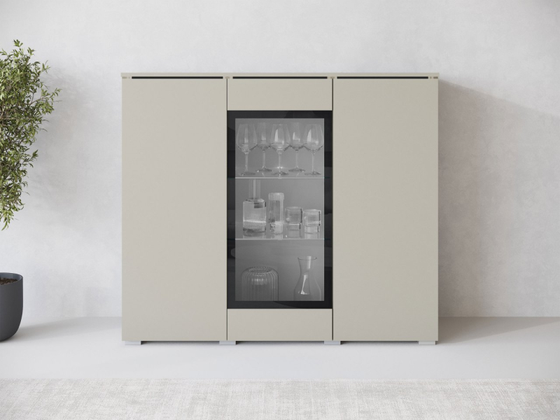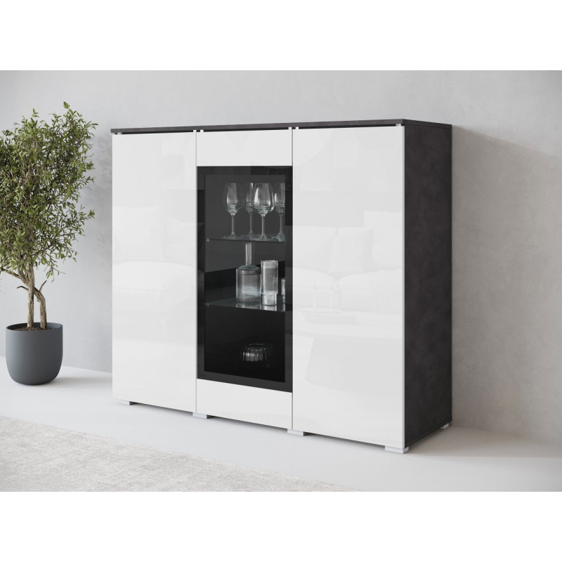Komoda s vitrínou nabízí promyšlený design. Uzavřené úložné prostory vám umožní uložit potřebné věci ve vašem obytném prostoru. Na druhé straně prosklená vitrína působivě vystaví elegantní sklo, suvenýry nebo dekorace a dodá interiéru prestižní nádech.