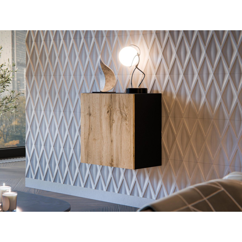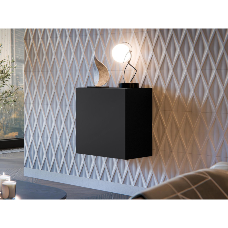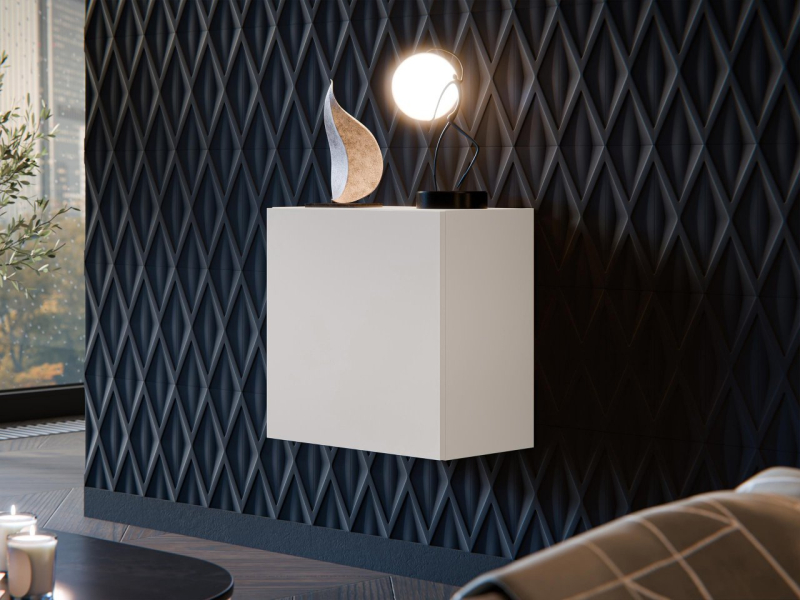 Závěsná vitrína má praktické police na knihy, dekorace a doplňky denní potřeby. Vestavěná přední část zdůrazňuje minimalistický charakter vitríny v obývacím pokoji.
