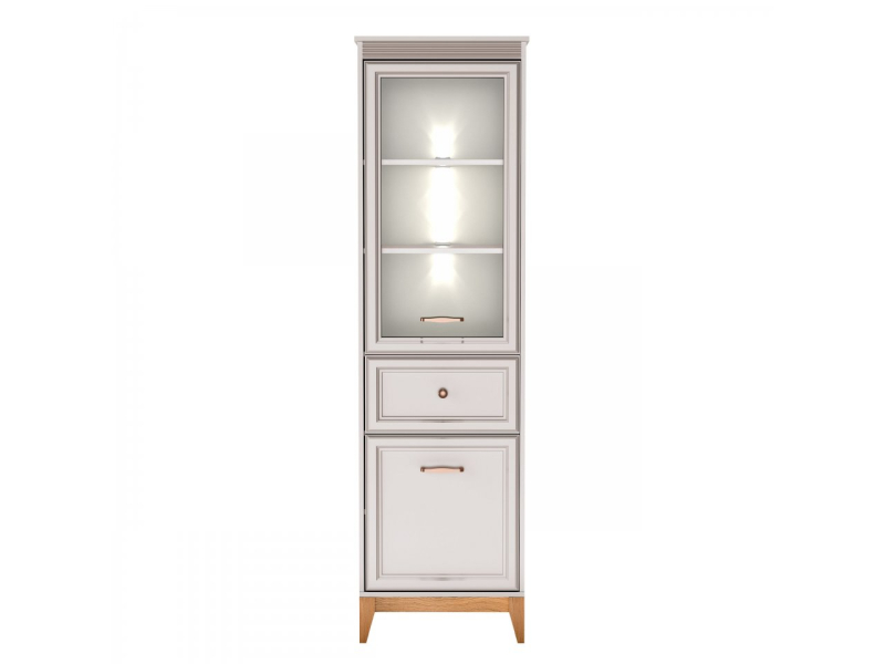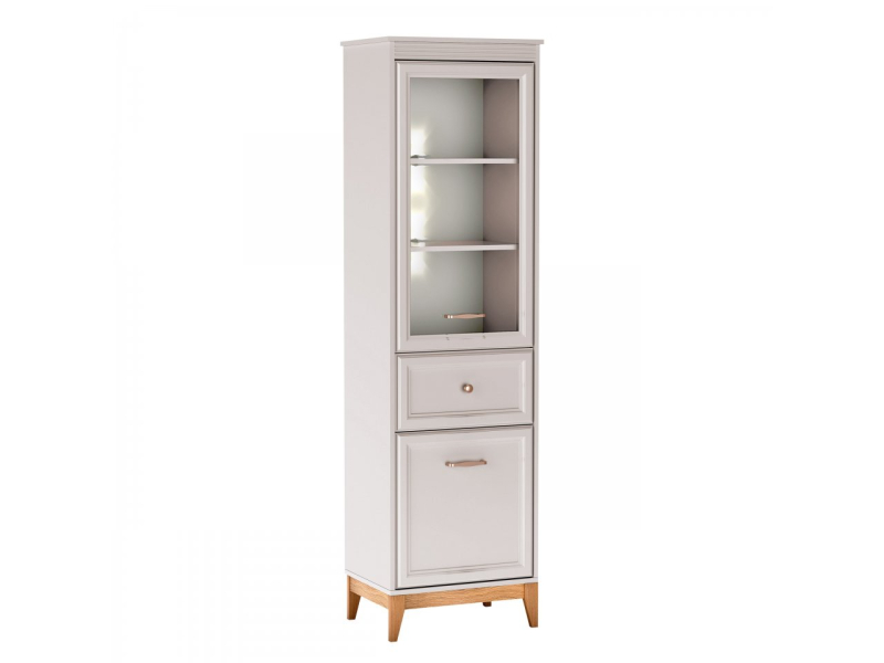 Skleněná deska umožňuje efektivně vystavit vaše oblíbené dekorace, porcelán nebo sklo, zatímco volitelné LED osvětlení vytváří útulnou a atmosférickou atmosféru večer. Spodní část vitríny nabízí prostornou skříňku a praktickou zásuvku, která poskytuje pohodlné uložení každodenních nezbytností.