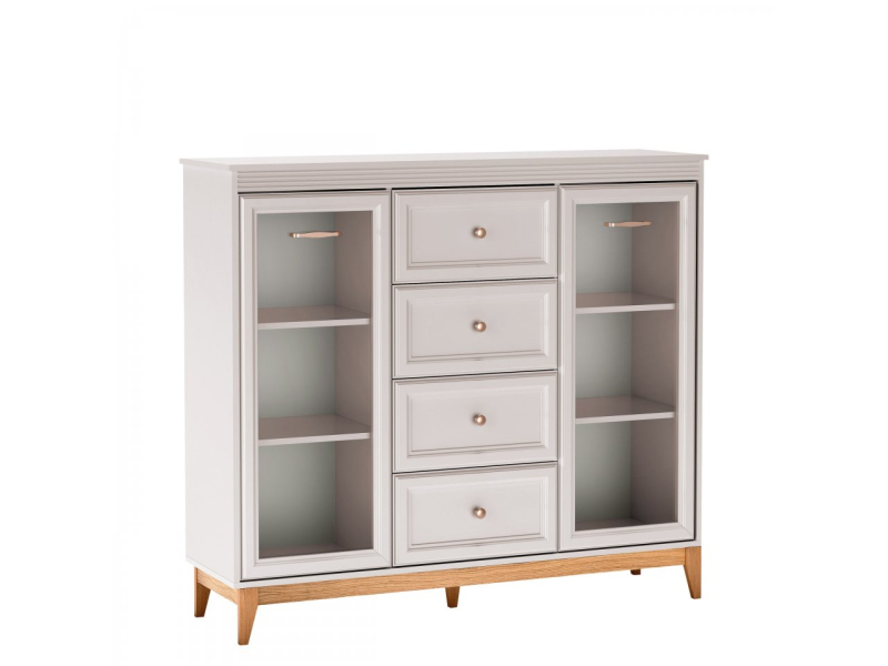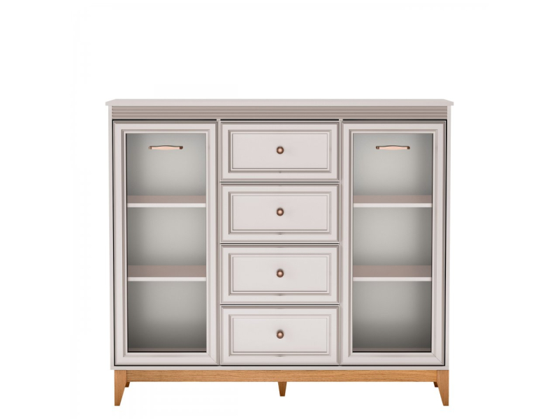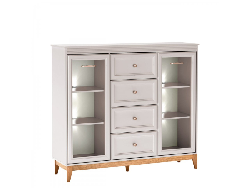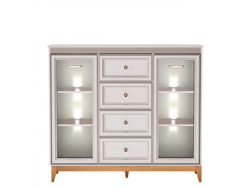 Vitrína má čtyři prostorné zásuvky, ideální pro uložení drobností, kabelů nebo dokumentů. Vitrína má skleněné dvířka, která umožňují vystavovat dekorace, fotorámečky nebo knihy. Můžete si také zakoupit LED osvětlení, které vylepší vaši expozici za sklem.
