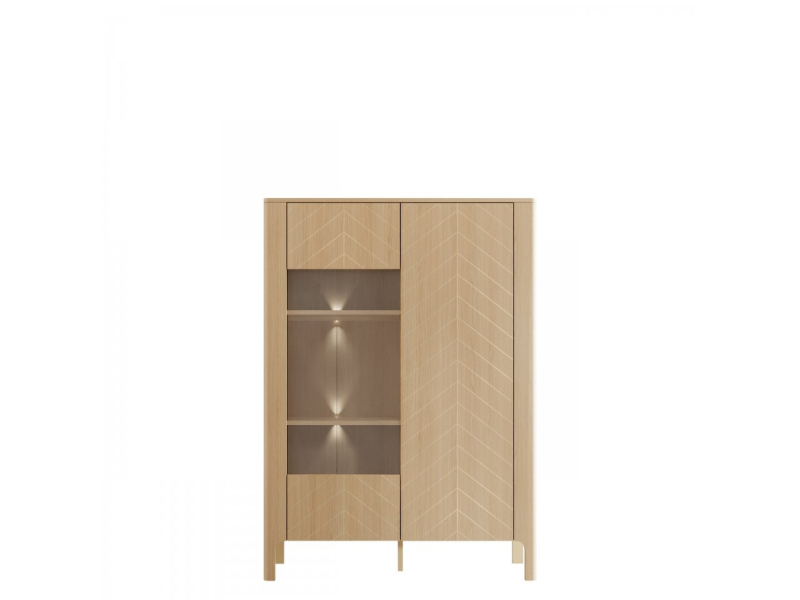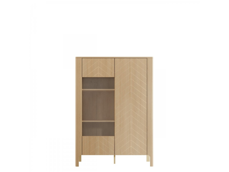 Skvělým způsobem, jak zařídit elegantní interiér, je vybavit ho nízkou vitrínou Malony ML03. Neutrální barevné schéma tohoto kusu se hodí k mnoha interiérovým stylům. Díky dekorativnímu vzoru rybí kosti na čelech dodává vitrína interiéru charakter a stává se součástí jeho designu.