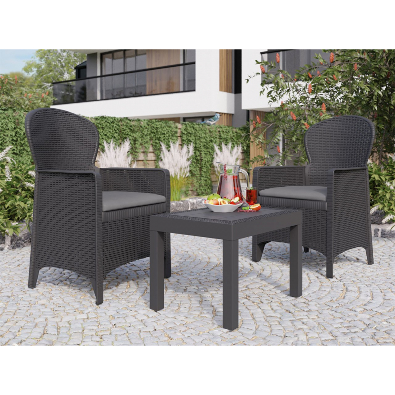 Celá zahradní sestava je lehká a praktická, což vám dává volnost a jednoduchost při přesouvání a přizpůsobování nábytku prostředí. Souprava obsahuje dvě křesla s polštáři na sedadle a stolek.