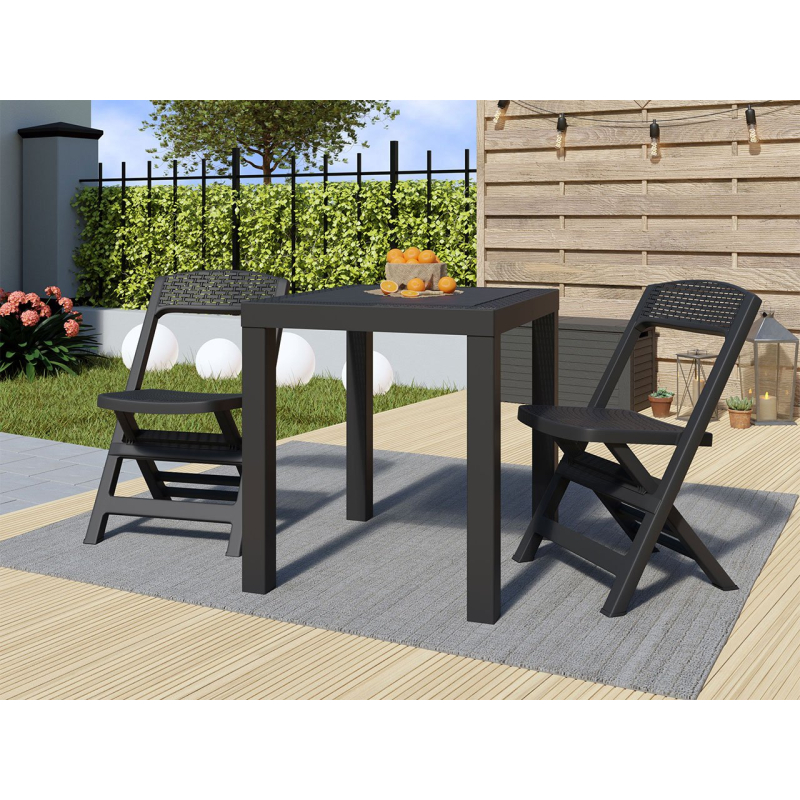 Sestava zahradního nábytku Zowir je dokonalým řešením pro lidi, kteří si chtějí vytvořit pohodlné a estetické místo k odpočinku venku. Souprava obsahuje dvě židle a stůl, které jsou vyrobeny z pevného a odolného polypropylenu. Díky tomu je nábytek odolný vůči mechanickému poškození a povětrnostním vlivům.