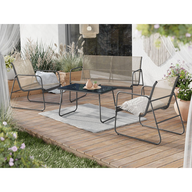Souprava obsahuje čtyři prvky: dvě židle, zahradní pohovku a stůl. Prezentovaný zahradní nábytek nabízí pohodlná sedadla s područkami. Díky tomu bude jejich používání mimořádně příjemné a pohodlné. Jejich montáž je mimořádně jednoduchá, což znamená, že mrknutím oka budete odpočívat zabaleni v pohodlí a uklidňujícím pohledu do přírody. Soupravu se doporučuje chránit před nepříznivými povětrnostními vlivy.