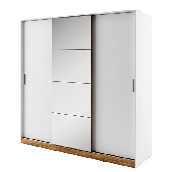 Posuvná skříň získala moderní a zajímavý vzhled díky zrcadlu umístěnému na středních posuvných dveřích a minimalistickým plastovým držadlům. Ozdobným detailem je dřevitá imitace dubu.