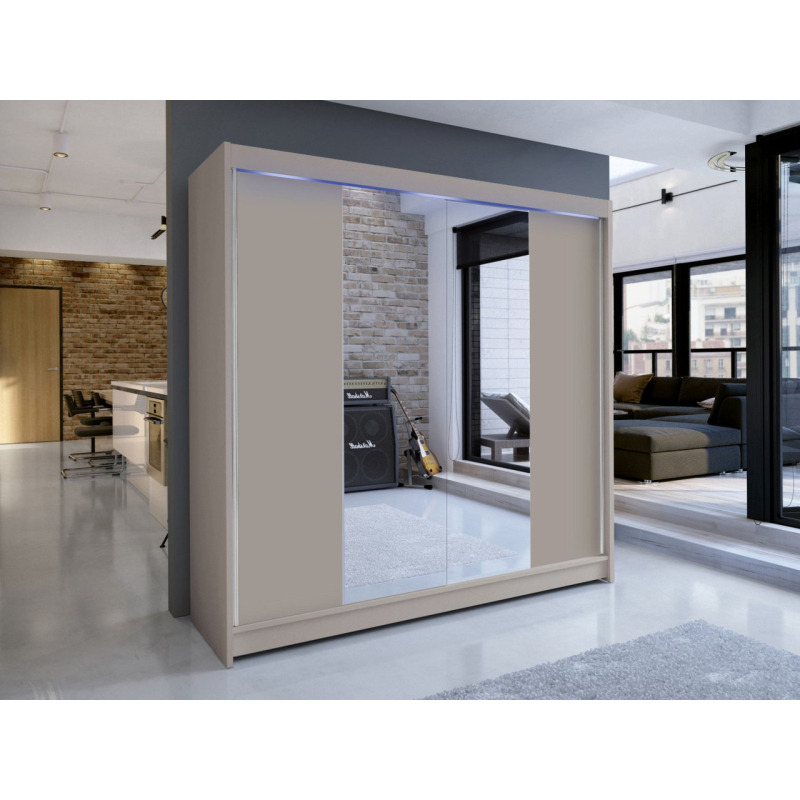 Další výhodou posuvné skříně Bar II jsou zrcadla, která byla umístěna na jeho čelách - opticky zvětší místnost a dokonale ji osvětlí. V doplňkové variantě má skříň možnost zakoupit osvětlení RGB LED, což mu dodá jedinečný charakter.