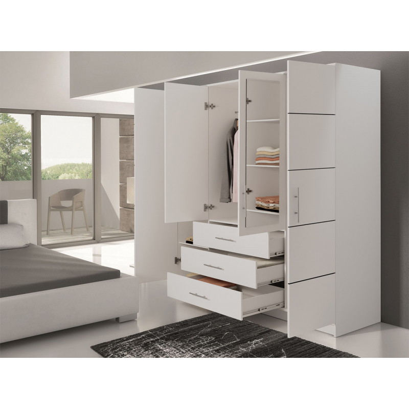Tato módní elegance nabízí značný úložný prostor. Uvnitř ukrývá police na složené oblečení i dlouhé tyče na zavěšení ramínek. Důmyslně uspořádaný střed velké zrcadlové skříně obsahuje také zásuvky. Snadný přístup k oděvům v nich uloženým zefektivňuje ranní výběr stylu.