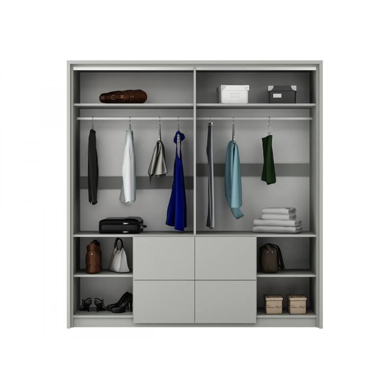 Šatní skříň se vyznačuje minimalistickým zpracováním a symetrickým rozdělením na části. Jednoduché hliníkové úchytky a zrcadlo umístěné ve střední části jsou dekorativními akcenty skříně. Zrcadlo bude mít jistě pozitivní vliv na optické zvětšení prostoru. Vnitřní prostor modelu Neiba se vyznačuje promyšleným uspořádáním polic, závěsných tyčí a zásuvek. Zásuvky lze otevírat pomocí systému Push Latch.