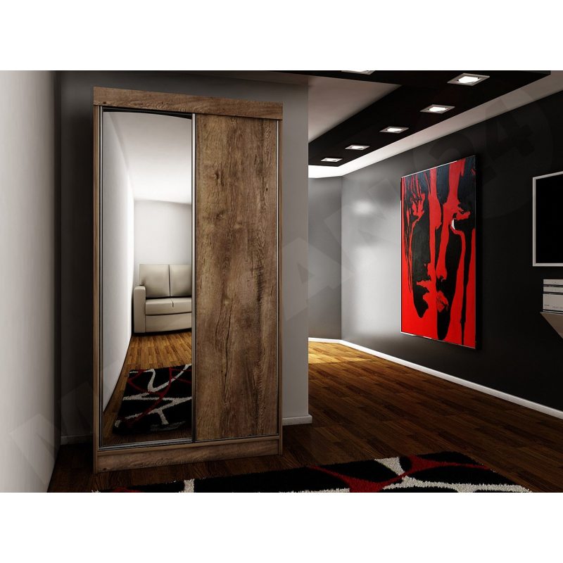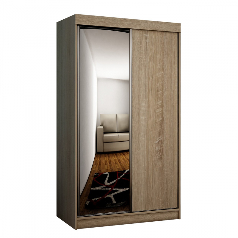 Posuvná skříň se zrcadlem Sahara 23/100 se skvěle hodí do ložnice, obývacího pokoje nebo předsíně. Velké zrcadlo zdobící jedno z čel šatníku opticky zvětší interiér a navíc vám umožní vidět odraz celé vaší postavy předtím, než vyjedete ven. Uvnitř je posuvná skříň vybavena řadou prostorných polic a šatních tyčí. Do takto řešeného úložného prostoru bez problémů umístíte oblečení, ale také krabice s botami.