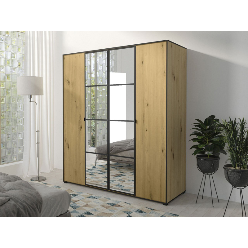 Velká čtyřdveřová skříň Birelto 180 cm je praktický a módní kus nábytku do obývacího pokoje, ložnice a šatníku. Jednotné barvy předních dílů doplňují tmavé rámy. Tato kombinace poskytuje módní aranžérský efekt, který dodává charakter dekorace celé místnosti. Předností šatníku je také originální zrcadlo.
