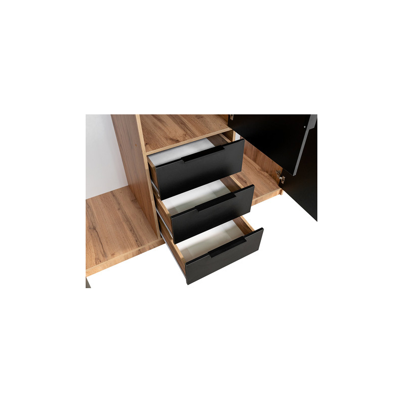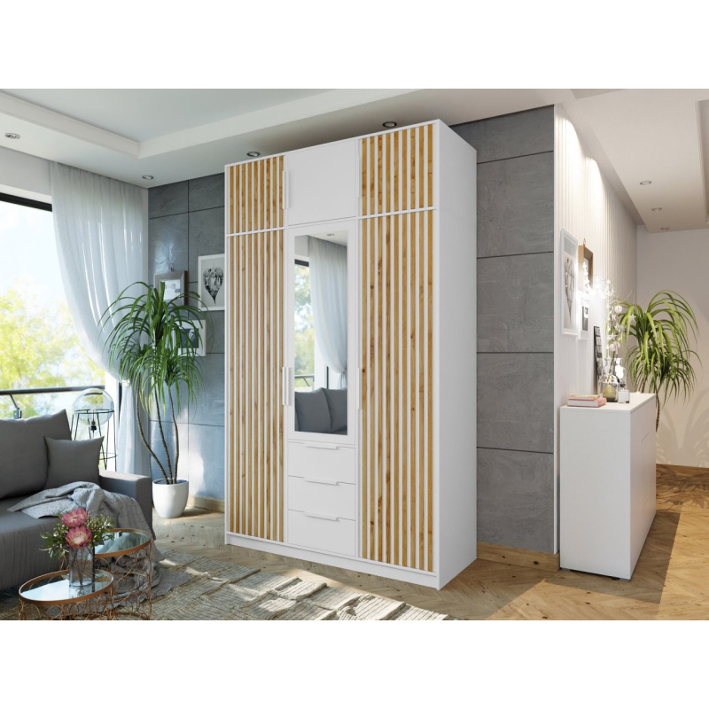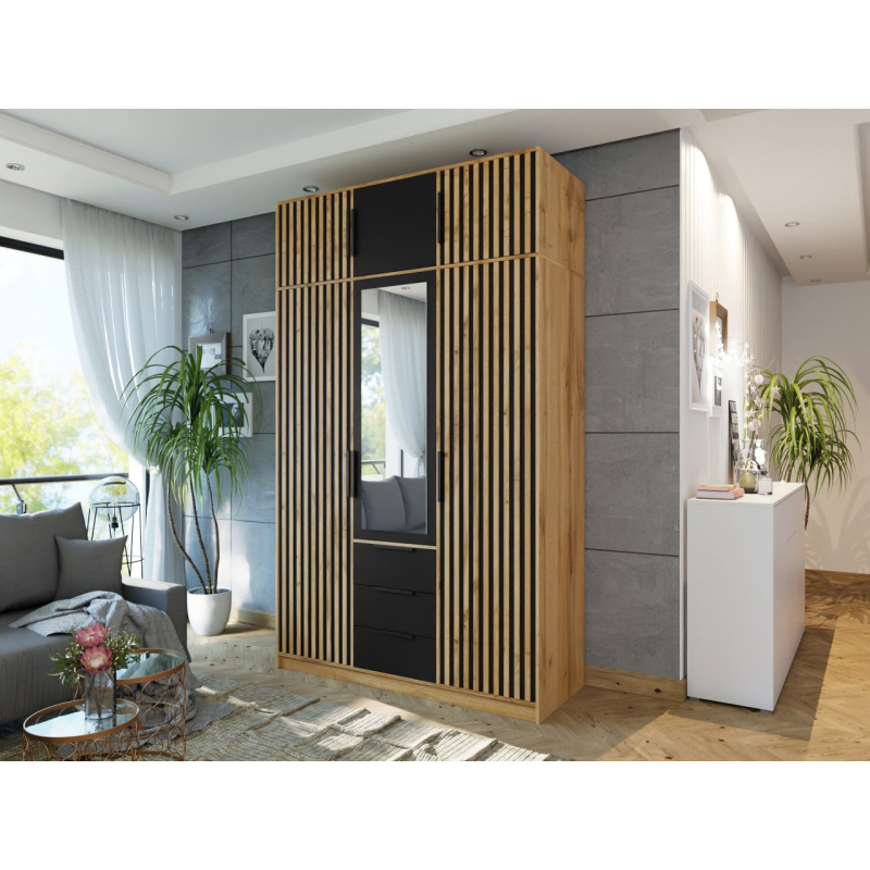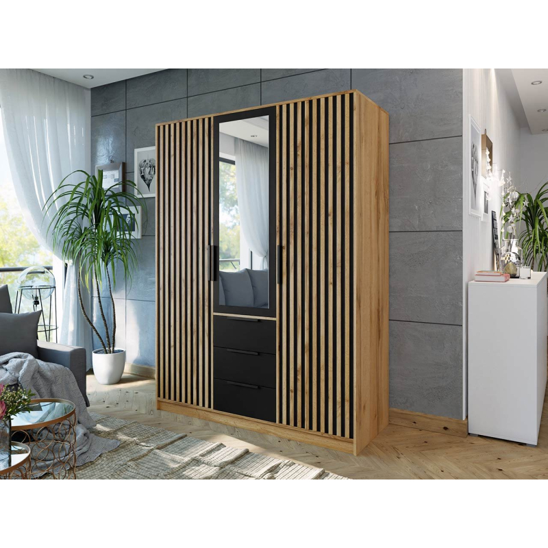 Šatní skříň se zrcadlem je nejen vizuálně zajímavým doplňkem bytu, ale také praktickým kusem nábytku na odkládání oblečení či jiných předmětů. Prostorné police, šatní tyče a tři hluboké zásuvky jsou kombinací, která vám stylově zaručí maximální prostor.