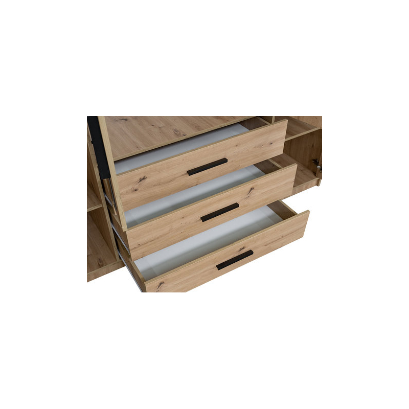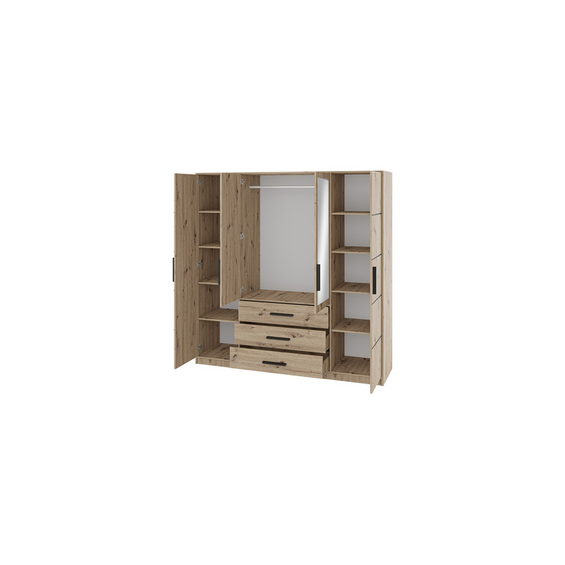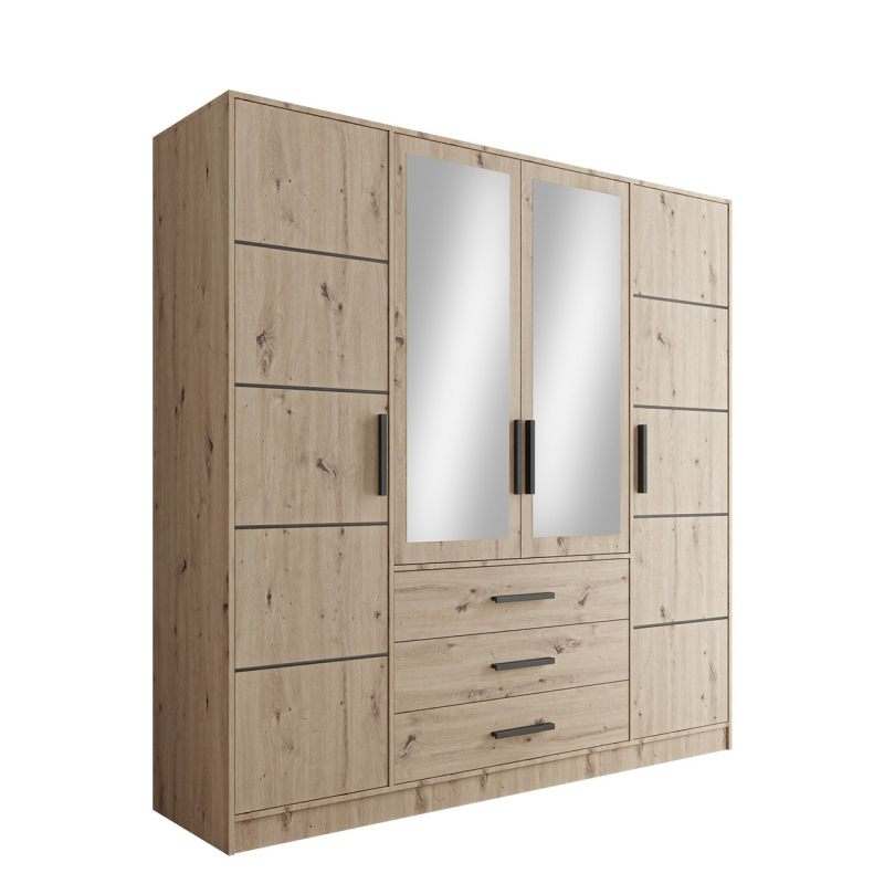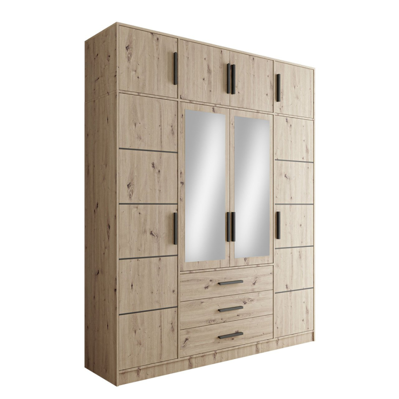 Šatní skříň zaujme svou kapacitou. Vybavena zásuvkami a policemi umožňuje organizované ukládání oblečení, doplňků a dalších potřebných předmětů. Model je vybaven i prostorným prostorem na ramínka - ideální místo pro saka, košile a šaty. Další výhodou jsou dvě velká zrcátka umístěná vpředu. Praktický dekorativní prvek, který poslouží pro každodenní použití a zatraktivní interiér.