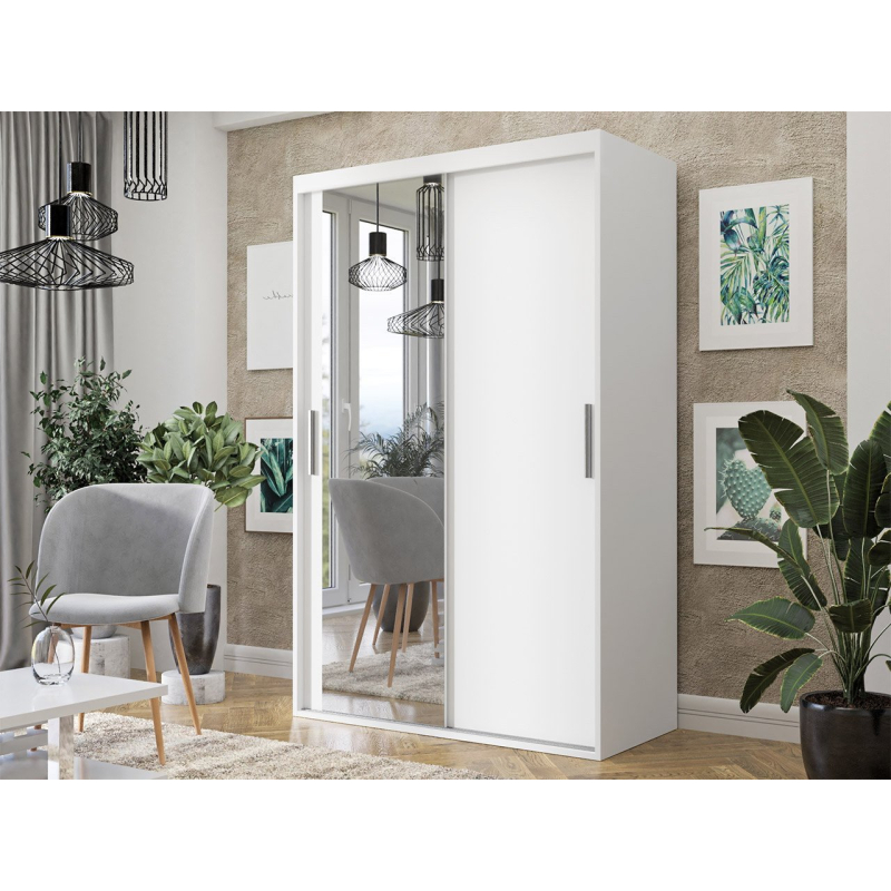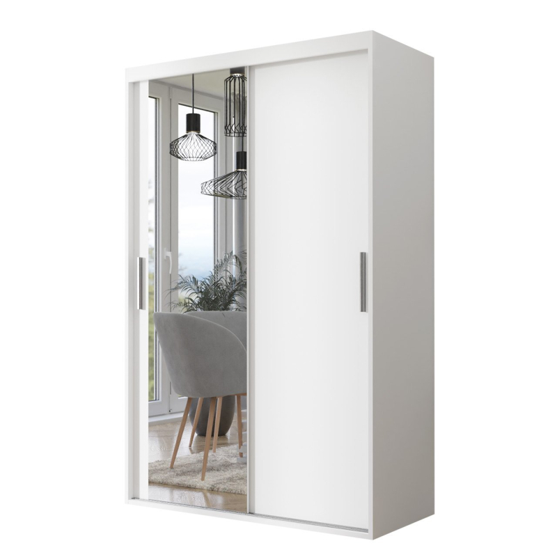 Šatní skříň Missisipi 120 se zrcadlem na jedné přední straně je praktickým řešením do ložnice, chodby nebo i obývacího pokoje! Prezentovaný model nabízí velké zrcadlo umístěné na jedné čelní straně a systém posuvných dveří. Zrcadlo prostor opticky zvětšuje a posuvné dveře umožňují umístit šatní skříň i do úzké místnosti.