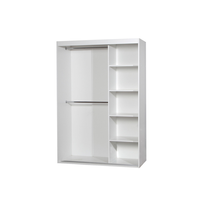 Interiér šatní skříně Missisipi nabízí praktické uspořádání polic a věšáků, což poskytuje dostatek úložného prostoru. Šatní skříň můžete otevřít pomocí ozdobných plastových úchytů.