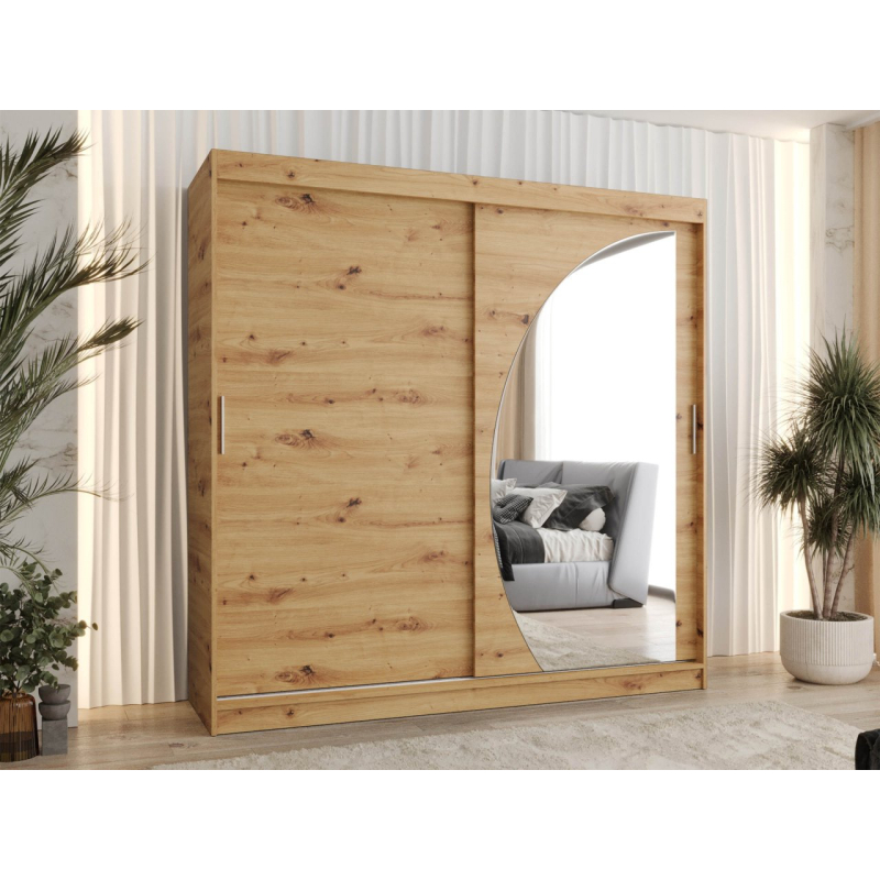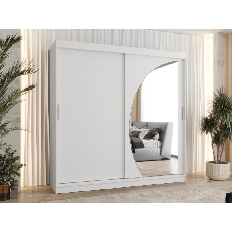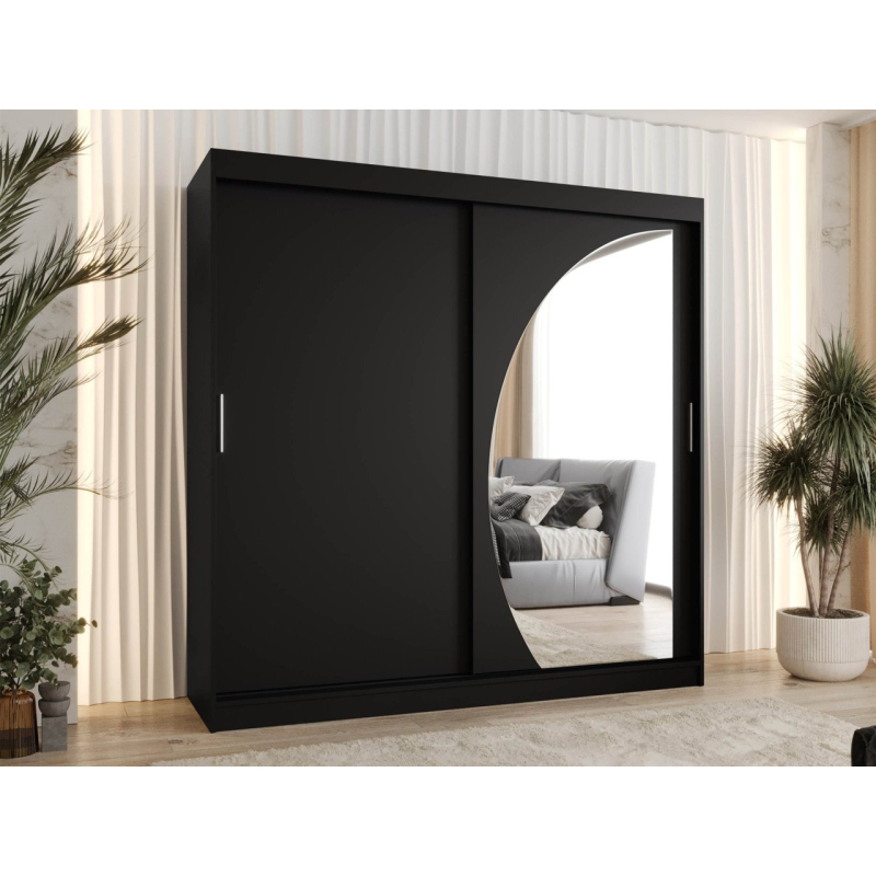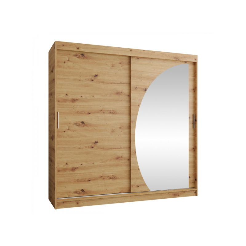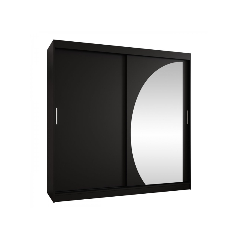 Zrcadlová šatní skříň Grilion 200 v sobě spojuje dvě výhody, které při nákupu nábytku nejčastěji očekáváme. Jde o prezentační a praktická řešení. Naše hrdinka má krásný vzhled, který se skládá z klasického tvaru v kombinaci se zaobleným zrcadlem a posuvnými dveřmi. Celek doplňují stříbrné rukojeti.