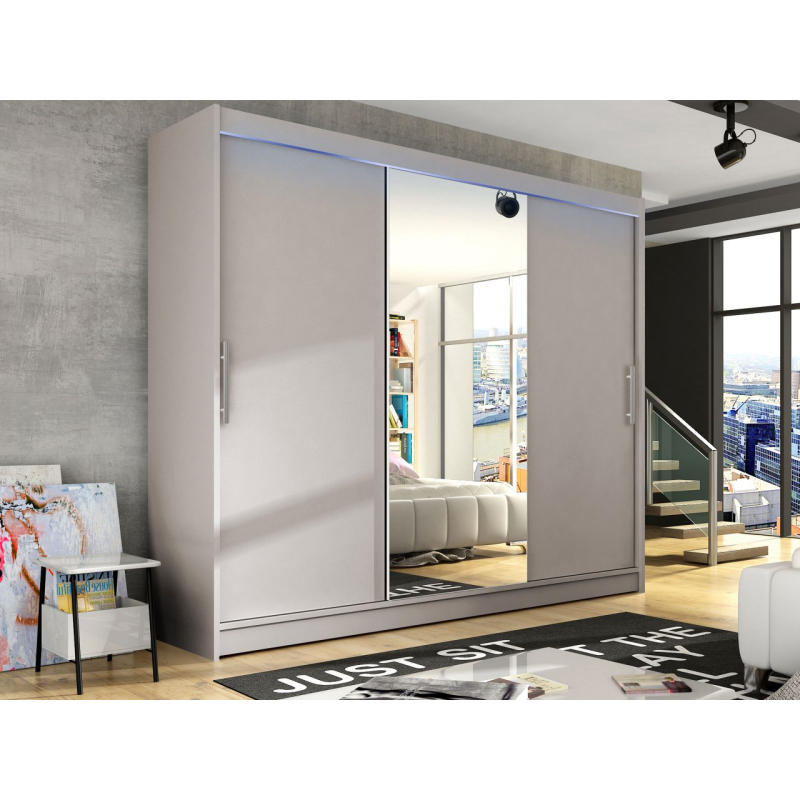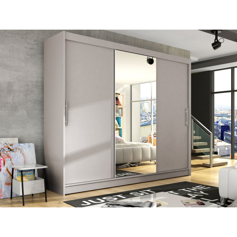Šatní skříň s posuvnými dveřmi Dasto 250 se bude hodit do vaší domácnosti. Vejdou se do ní věci denní potřeby, oblečení i cestovní kufry. Dveře skříně se snadno posouvají a vertikální zrcadlo umístěné na prostředních dveřích opticky zvětšuje místnost. Prostorné police a věšáková tyč pomáhají oddělit oblečení. Úchyty namontované na dveřích usnadňují jejich přemístění v případě potřeby. Šatní skříň lze umístit do ložnice nebo do předsíně jako místo pro svrchní oblečení. Celá konstrukce skříně je vyrobena z laminované desky.