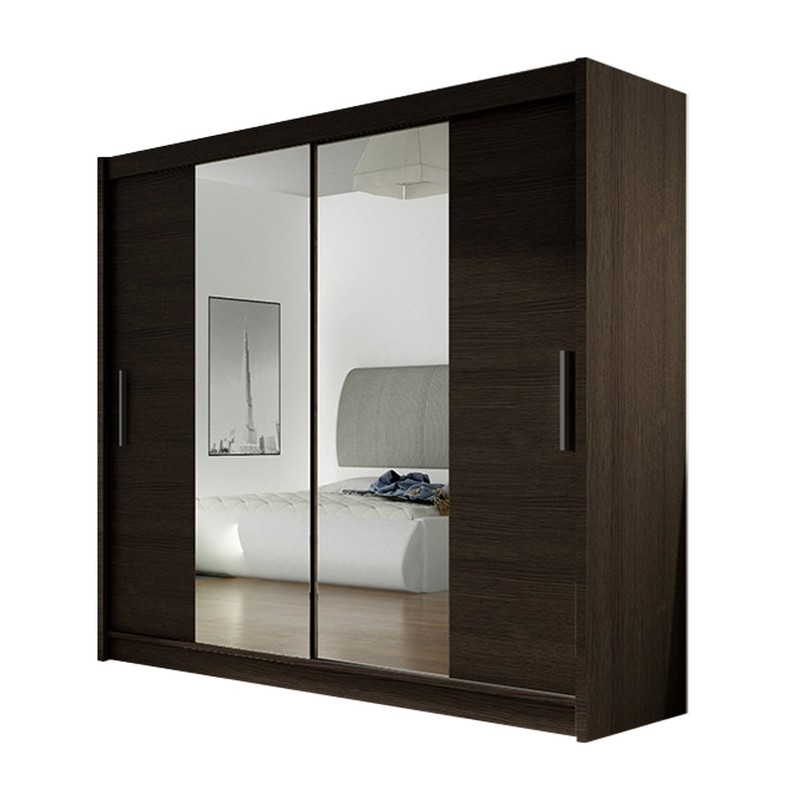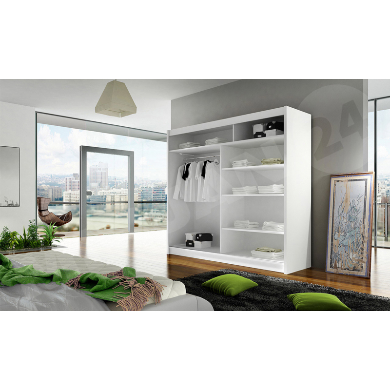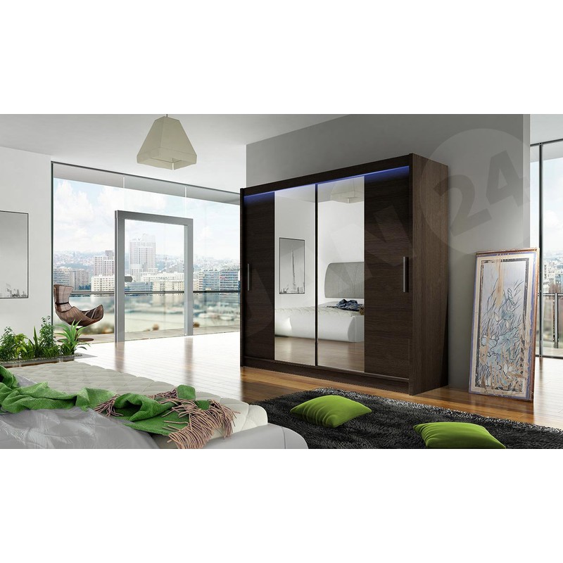 Šatní skříň London je k dispozici v univerzálních barvách, díky kterým ji snadno sladíte s uspořádáním ložnice, obývacího pokoje nebo předsíně. Díky šatní skříni bude v místnosti více světla, což je možné díky podlouhlému zrcadlu umístěnému na přední straně posuvných dveří.