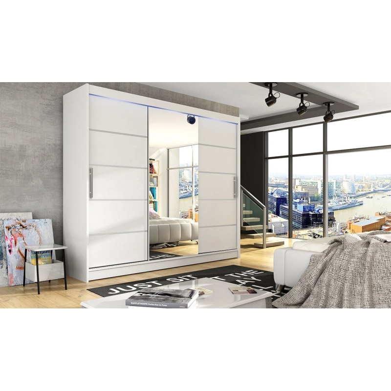 Fronty šatníku mají systém posuvných dveří, který usnadňuje otevírání a šetří místo. Za svůj zajímavý a moderní vzhled vděčí šatní skříň Dasto VI charakteristickým vsadkám na čelech skříně a jednoduchému tvaru. Doplňkovým prvkem, který dokonale prosvětlí a zvětší místnost, je zrcadlo umístěné na jednom z čel šatníku.