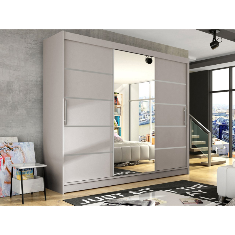 Fronty šatníku mají systém posuvných dveří, který usnadňuje otevírání a šetří místo. Za svůj zajímavý a moderní vzhled vděčí šatní skříň Dasto VI charakteristickým vsadkám na čelech skříně a jednoduchému tvaru. Doplňkovým prvkem, který dokonale prosvětlí a zvětší místnost, je zrcadlo umístěné na jednom z čel šatníku.