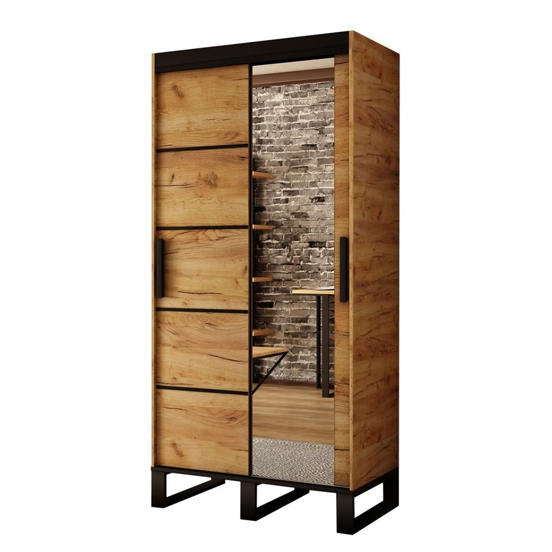 Šatní skříň Willow se zrcadlem a posuvnými dveřmi má na pravé straně police a 2 zásuvky, na levé straně má horní a dolní věšákovou část. Stojí na pevných kovových nožkách.