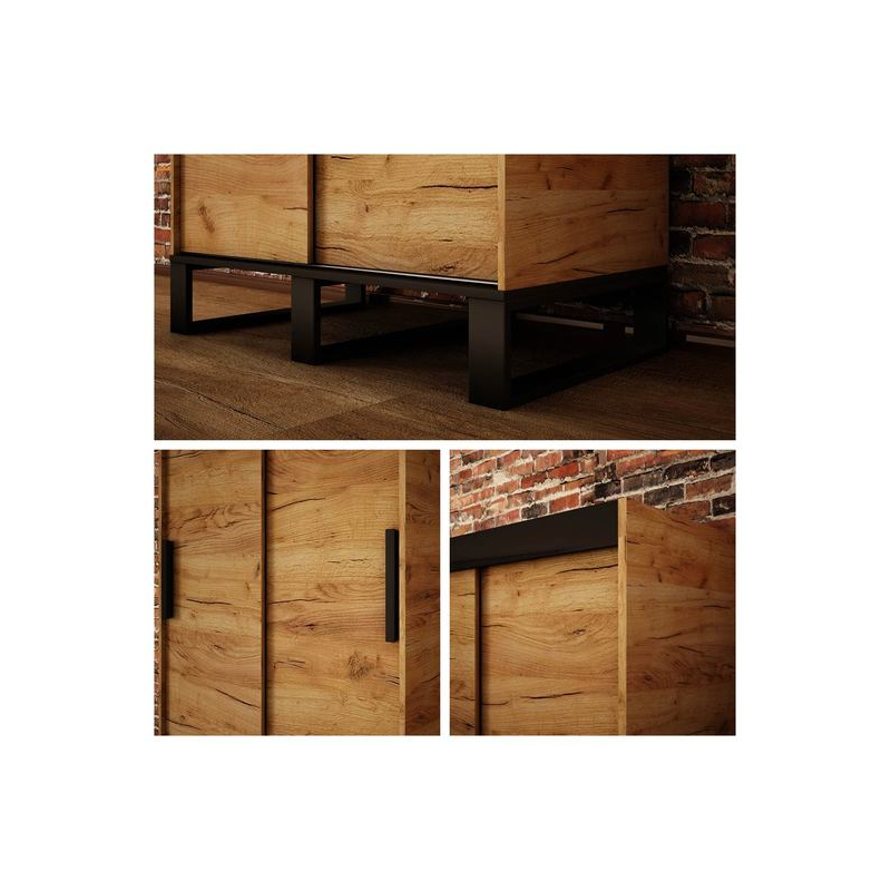 Skříň Willow V4 s posuvnými dveřmi 100cm je návrhem pro lidi, kteří hledají originální nábytek do svého interiéru. Skříň Willow odkazuje na industriální, rustikální a loftový styl. Tento charakter nábytku je ovlivněn takovými prvky, jako jsou barvy čel, kovové nohy o výšce 20 cm a minimalistické úchytky z bukového dřeva. V přední části skříně je navíc velké zrcadlo.