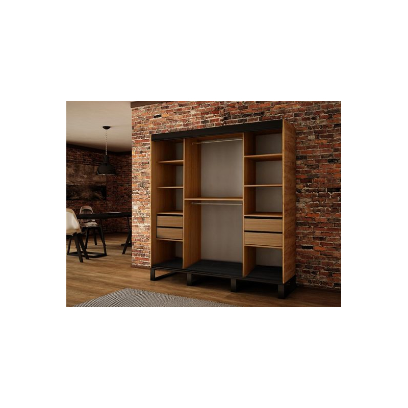 Šatní skříň Willow se zrcadlem a posuvnými dveřmi uspokojí i náročnější uživatele. Uvnitř najdete na pravé a levé straně police a 2+2 zásuvky, uprostřed horní a dolní věšákovou část na zavěšení oblečení. Stojí na pevných kovových nožkách.