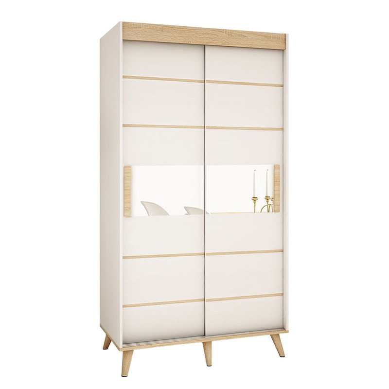 Posuvná skříň Bravo má jednoduché tvary a dokonalý vzhled. Vysoké dřevěné nohy způsobují, že je opticky lehčí a menší. S takovým šatníkem můžete snadno zlepšit vizuální proporce místnosti. Přední strana zdobená zrcadlem vytvoří iluzi prostornosti a dodá interiéru svěží a nadčasovou eleganci.