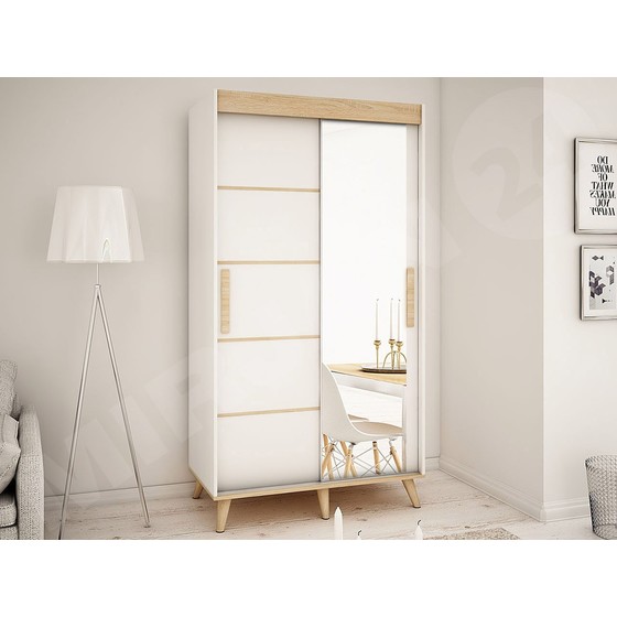 Skříň Bravo s posuvnými dveřmi přinese do vašeho obývacího pokoje atmosféru klidu a harmonie. Perfektně se hodí k minimalistickému i skandinávskému stylu. Přední část posuvné skříně je zdobena zrcadlem. Tento design opticky zvětšuje prostor a také pozitivně odráží světlo a osvětluje místnost. Interiér skříně je rozdělen na zóny, díky čemuž získáte další úložný prostor.