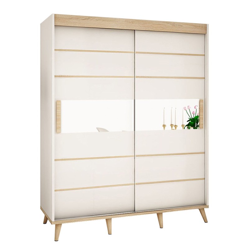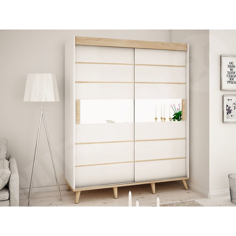 Skříň s posuvnými dveřmi z kolekce Bravo kombinuje dobrý design s pohodlím každodenního používání. Světlé barvy čelních částí skříně jsou zdobeny přírodním dřevem a zrcadlem. Tato kombinace dodá jedinečný vzhled celému interiéru a dodá pokoji elegantní a svěží vzhled. Interiér skříně je plný polic, zásuvek a šatních tyčí.