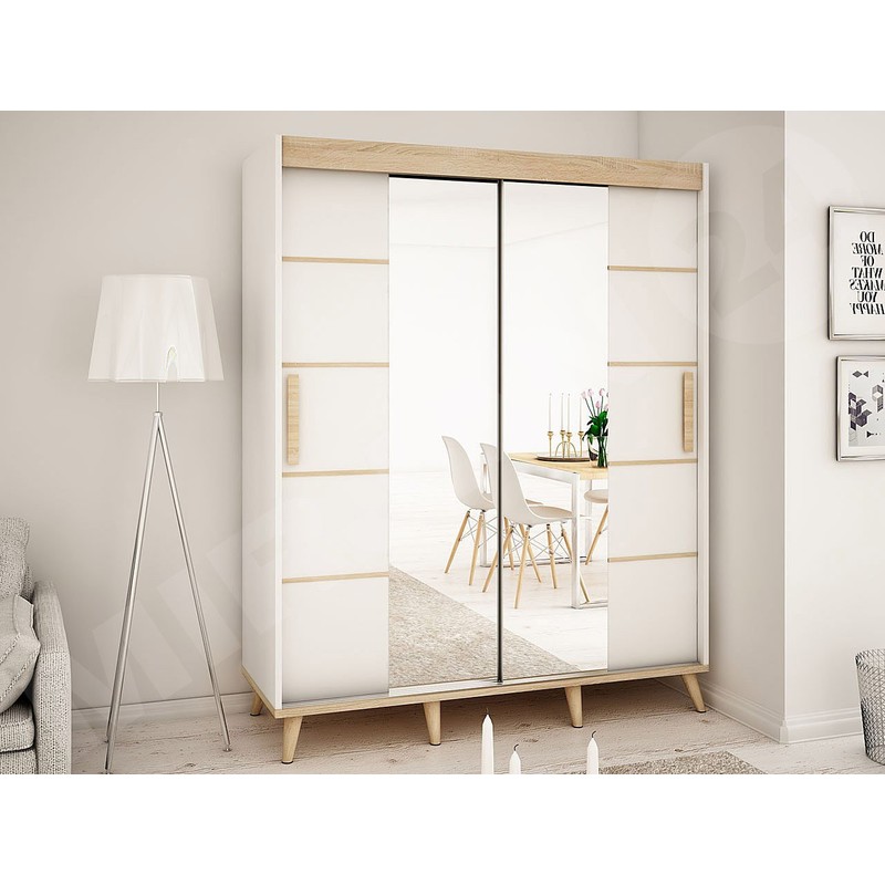 Bravo V4 je prostorná skříň s posuvnými dveřmi, široká 180 cm. Perfektně se hodí do skandinávského obývacího pokoje, ložnice nebo předsíně. Má charakteristické dřevěné nohy a úchyty a zrcadla na přední straně dveří, které vizuálně zvětšují místnost.